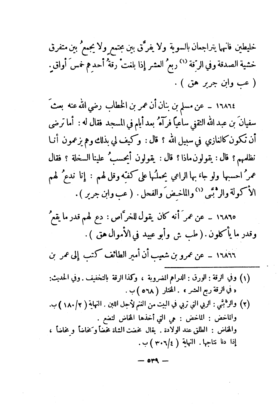 16864- عن مسلم بن بنان "أن عمر بن الخطاب رضي الله عنه بعث سفيان بن عبد الله الثقفي ساعيا فرآه بعد أيام في المسجد فقال له: أما ترضى أن تكون كالغازي في سبيل الله؟ قال: وكيف لي بذلك وهم يزعمون أنا نظلمهم؟ قال: يقولون ماذا؟ قال: يقولون أيحسب علينا السخلة؟ فقال عمر احسبها ولو جاء بها الراعي يحملها على كفه وقل لهم: إنا ندع لهم الأكولة والربى 2 والماخض والفحل". "عب وابن جرير".