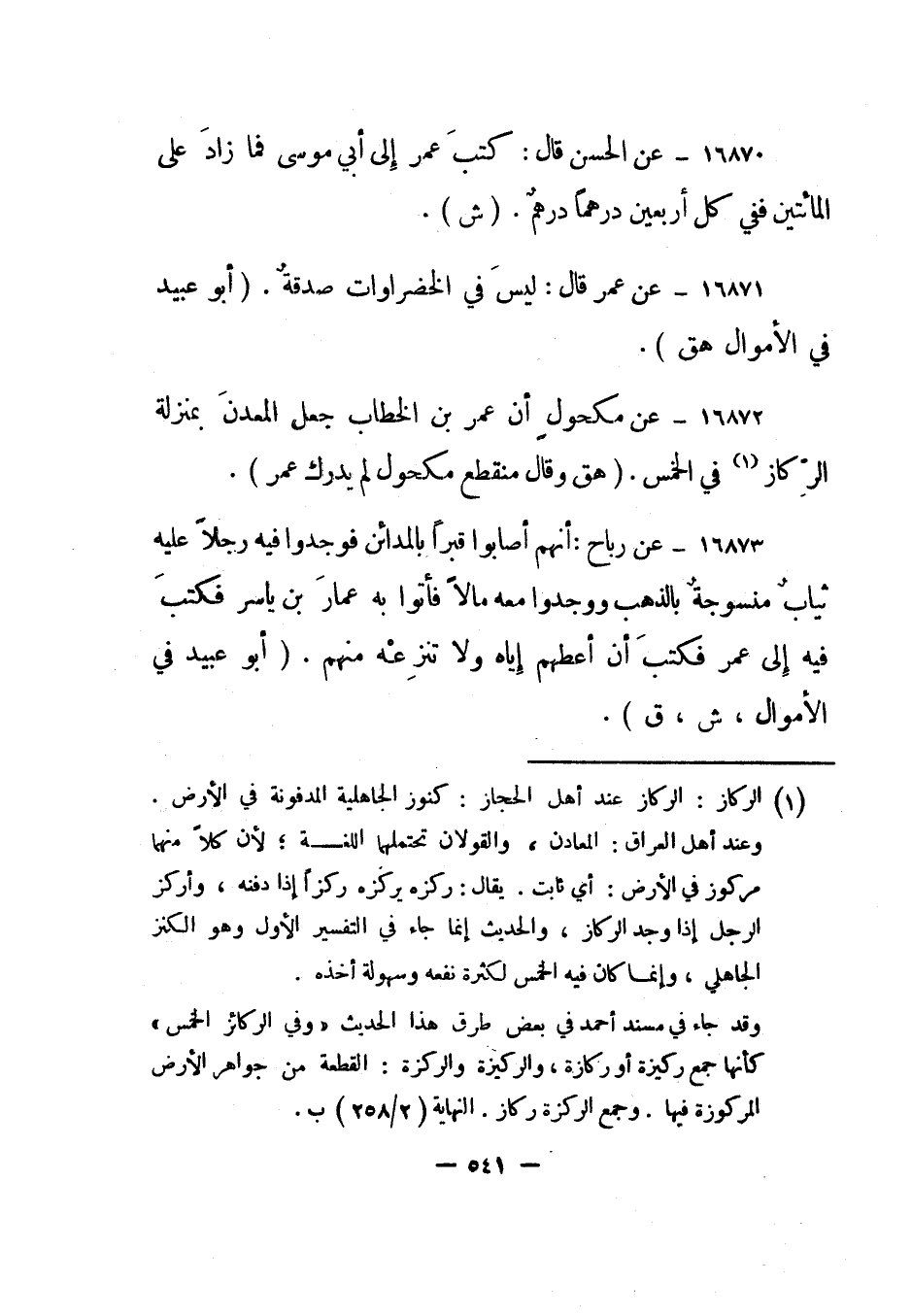 16872- عن مكحول "أن عمر بن الخطاب جعل المعدن بمنزلة الركاز 1 في الخمس". "هق وقال منقطع مكحول لم يدرك عمر".