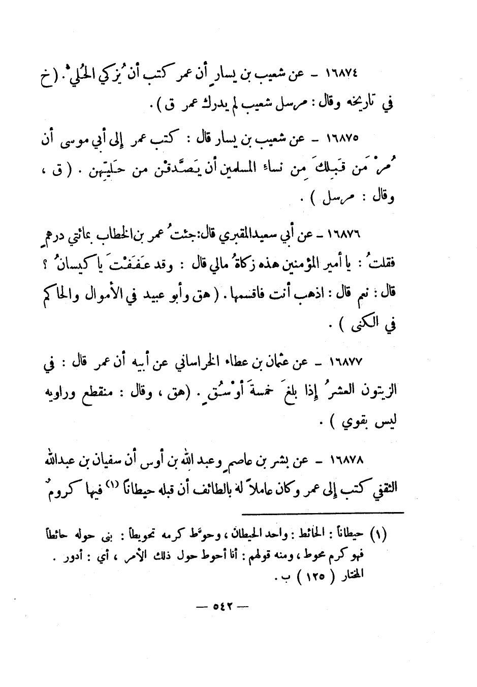 16878- عن بشر بن عاصم وعبد الله بن أوس أن سفيان بن عبد الله الثقفي "كتب إلى عمر وكان عاملا له بالطائف أن قبله حيطانا 1 فيها كروم