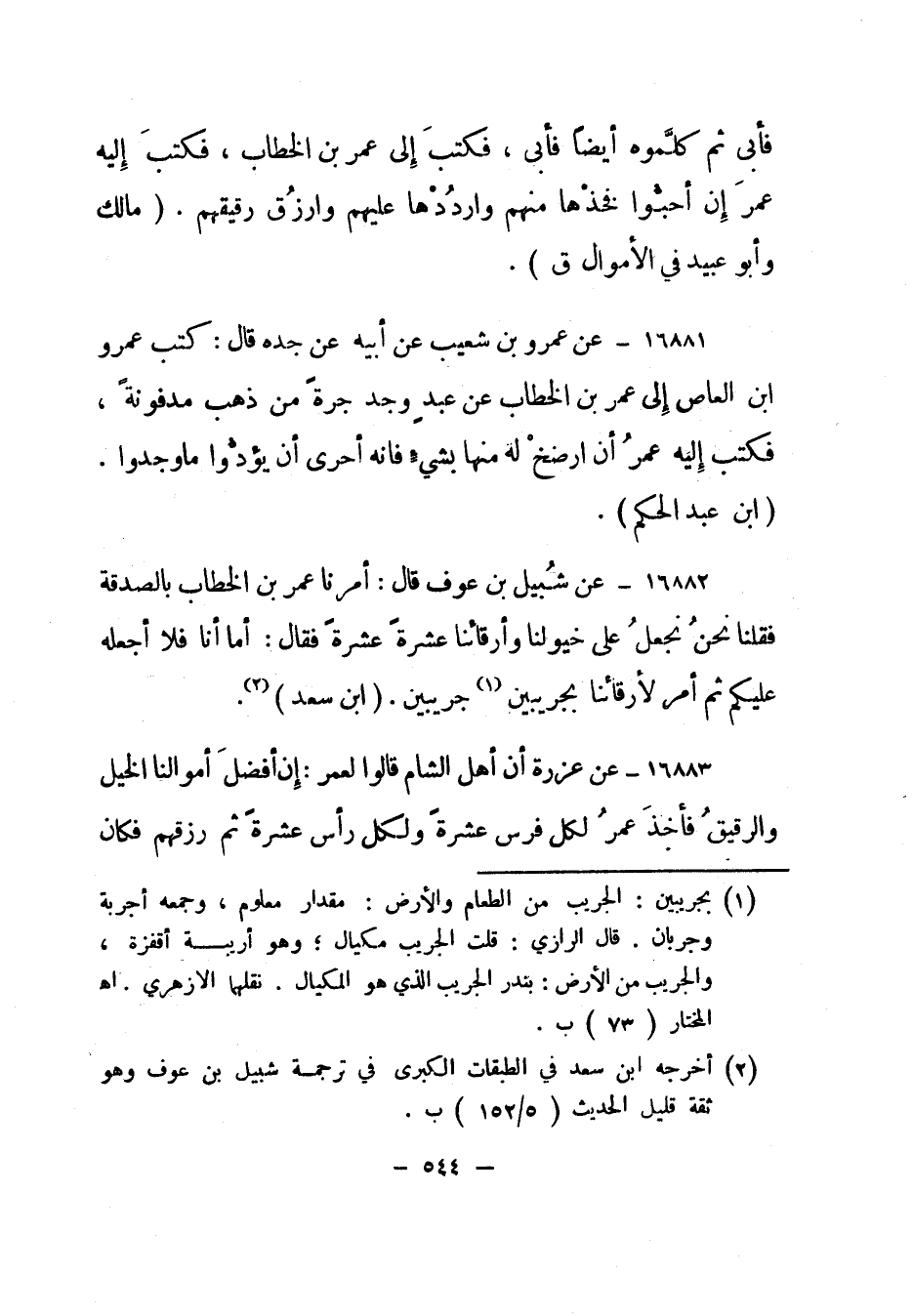 16882- عن شبيل بن عوف قال: أمرنا عمر بن الخطاب بالصدقة فقلنا نحن نجعل على خيولنا وأرقائنا عشرة عشرة فقال: أما أنا فلا أجعله عليكم ثم أمر لأرقائنا بجريبين 1 جريبين". "ابن سعد" 2.
