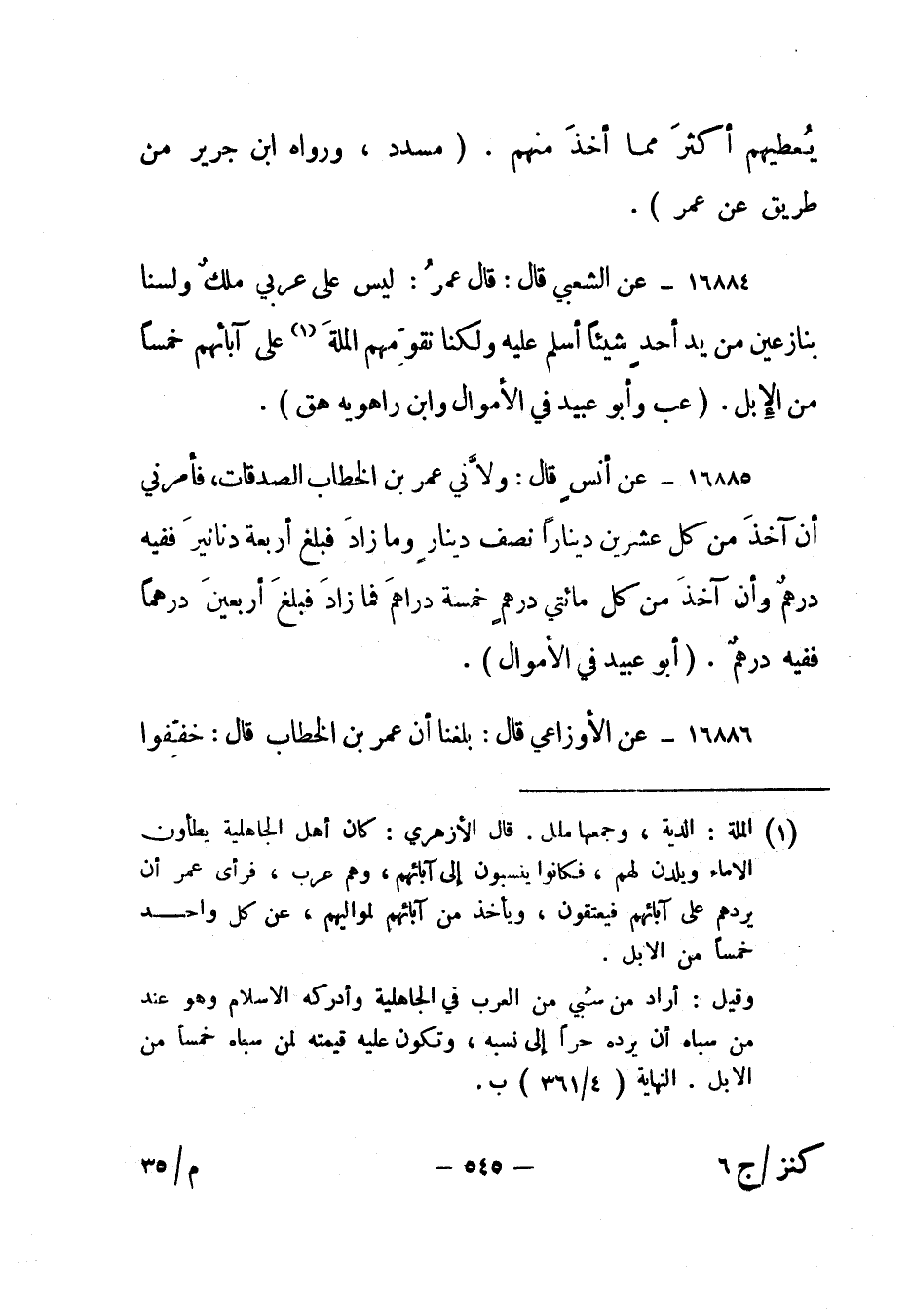 16885- عن أنس قال: "ولاني عمر بن الخطاب الصدقات، فأمرني أن آخذ من كل عشرين دينارا نصف دينار وما زاد فبلغ أربعة دنانير ففيه درهم وأن آخذ من كل مائتي درهم خمسة دراهم فما زاد فبلغ أربعين درهما ففيه درهم". "أبو عبيد في الأموال".