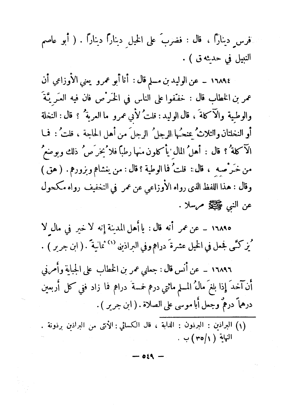 16895- عن عمر أنه قال: "يا أهل المدينة إنه لا خير في مال لا يزكى فجعل في الخيل عشرة دراهم وفي البراذين 1 ثمانية". "ابن جرير".