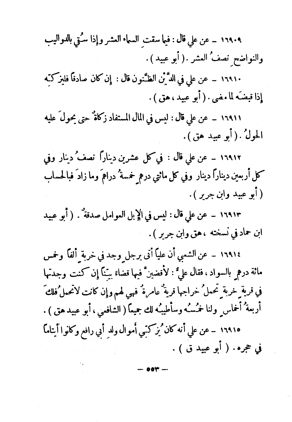 16915- عن علي "أنه كان يزكي أموال ولد أبي رافع وكانوا أيتاما في حجره". "أبو عبيد ق".
