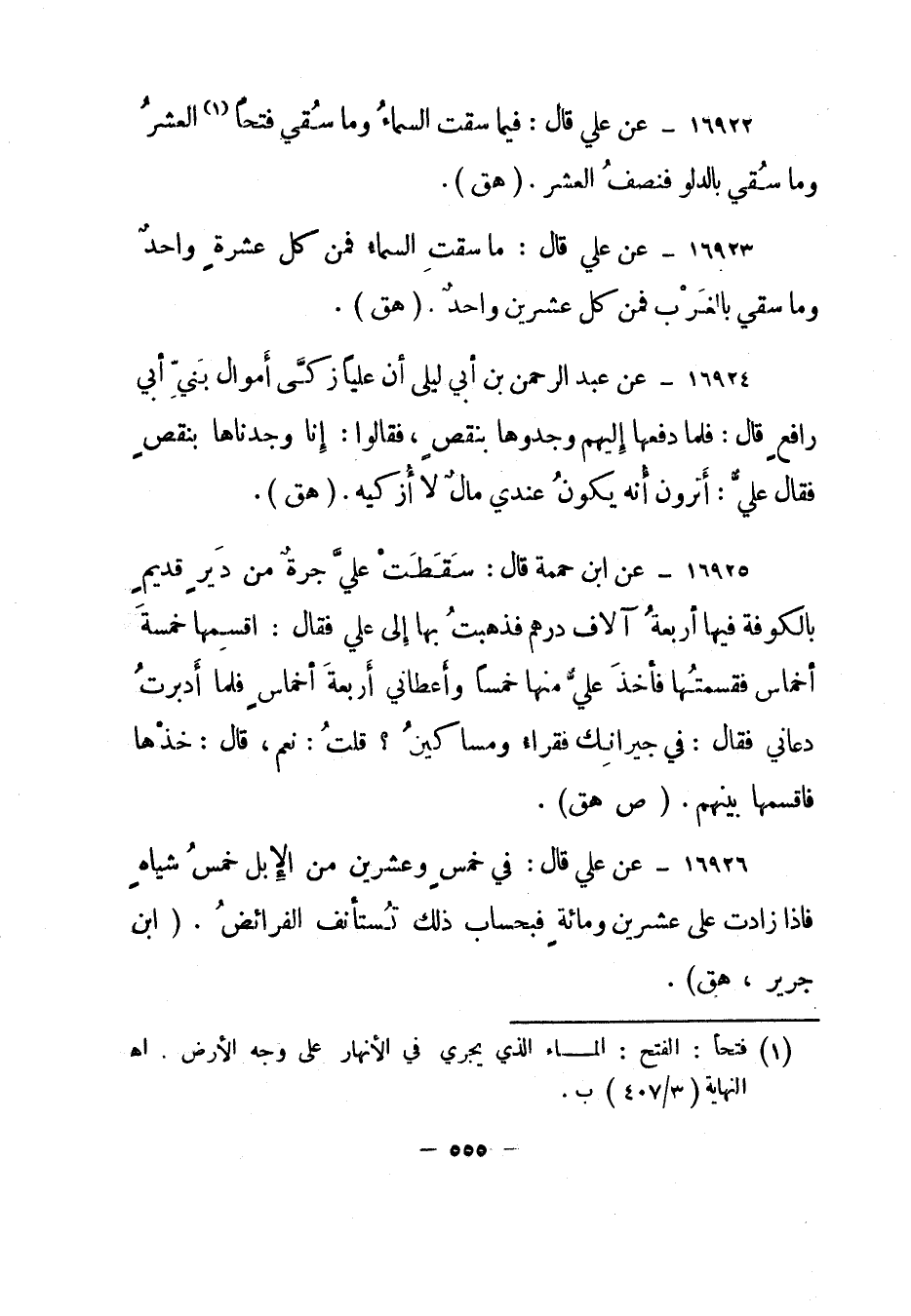 16922- عن علي قال: "فيما سقت السماء وما سقي فتحا 1 العشر وما سقي بالدلو فنصف العشر". "هق".
