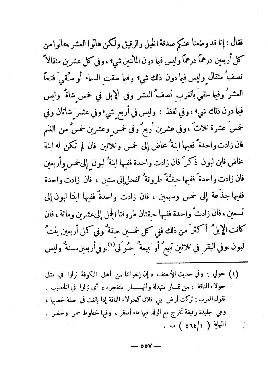 فقال: إنا قد وضعنا عنكم صدقة الخيل والرقيق ولكن هاتوا العشر، هاتوا من كل أربعين درهما درهما وليس فيما دون المائتين شيء، وفي كل عشرين مثقالا نصف مثقال وليس فيما دون ذلك شيء وفيما سقت السماء أو سقي فتحا العشر وفيما سقي بالغرب نصف العشر وفي الإبل في خمس شاة وليس فيما دون ذلك شيء، وفي لفظ: وليس في أربع شيء وفي عشر شاتان وفي خمس عشرة ثلاث، وفي عشرين أربع وفي خمس وعشرين خمس من الغنم فإن زادت واحدة ففيها ابنة مخاض إلى خمس وثلاثين فإن لم تكن له ابنة مخاض فابن لبون ذكر فإن زادت واحدة ففيها ابنة لبون إلى خمس وأربعين فإن زادت واحدة ففيها حقة طروقة الفحل إلى ستين، فإن زادت واحدة ففيها جذعة إلى خمس وسبعين، فإن زادت واحدة ففيها ابنتا لبون إلى تسعين، فإن زادت واحدة ففيها حقتان طروقتا الجمل إلى عشرين ومائة، فإن كانت الإبل أكثر من ذلك ففي كل خمسين حقة وفي كل أربعين بنت لبون، وفي البقر في ثلاثين تبيع أو تبيعة حولي 1، وفي أربعين مسنة وليس