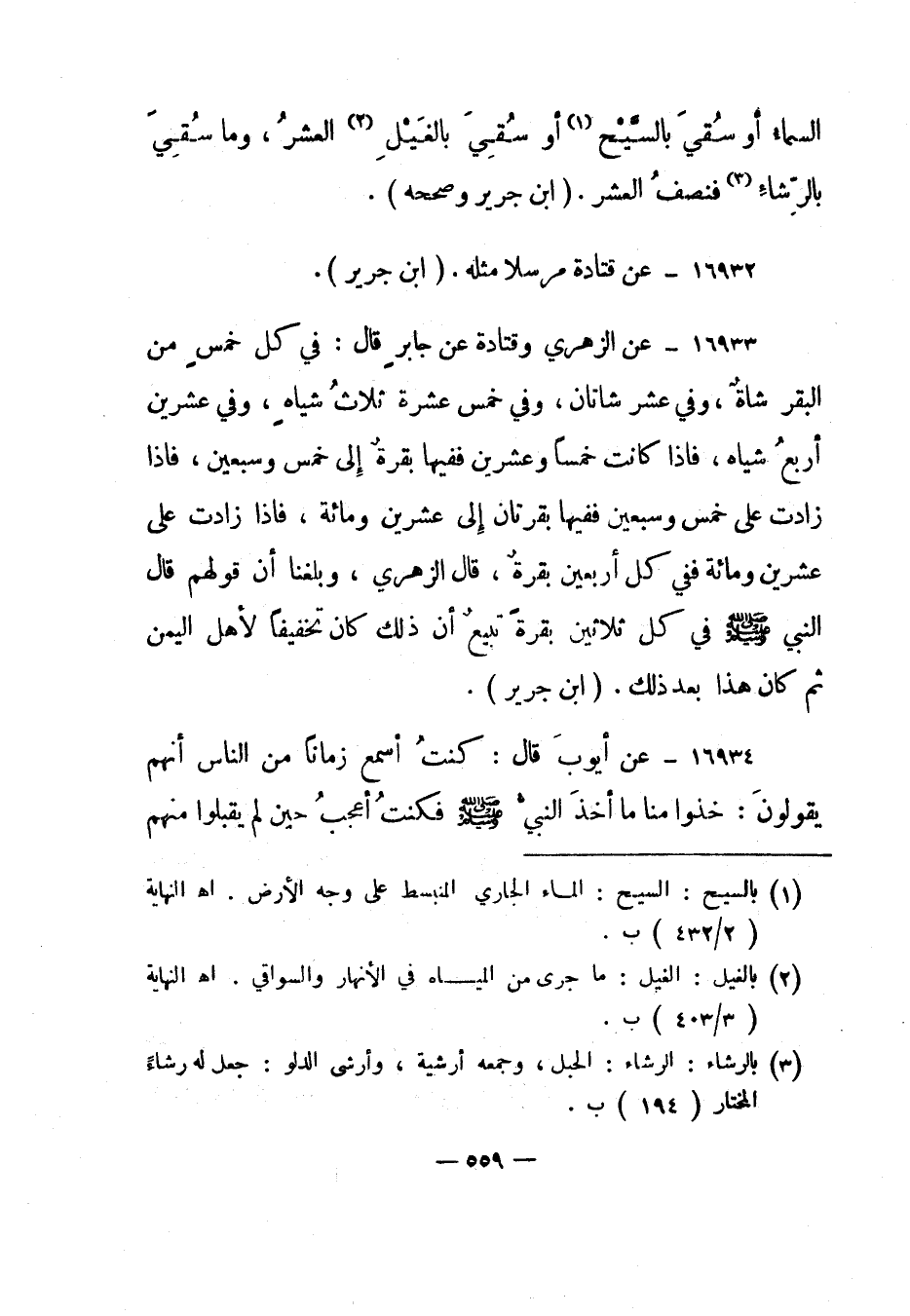 السماء أو سقي بالسيح 1 أو سقي بالغيل 2 العشر، وما سقي بالرشاء 3 فنصف العشر". "ابن جرير وصححه".