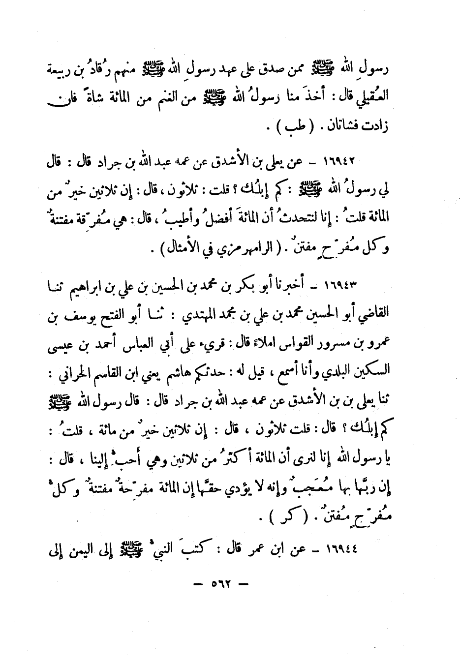 16943- أخبرنا أبو بكر بن محمد بن الحسين بن علي بن إبراهيم ثنا القاضي أبو الحسين محمد بن علي بن محمد المهتدي: ثنا أبو الفتح يوسف بن عمرو بن مسرور القواس إملاء قال: "قرئ على أبي العباس أحمد بن عيسى السكين البلدي وأنا أسمع، قيل له: حدثكم هاشم يعني ابن القاسم الحراني: ثنا يعلى بن الأشدق عن عمه عبد الله بن جراد قال: قال رسول الله صلى الله عليه وسلم: كم إبلك؟ قال: قلت ثلاثون، قال: إن ثلاثين خير من مائة، قلت: يا رسول الله إنا لنرى أن المائة أكثر من ثلاثين وهي أحب إلينا، قال: إن ربها بها معجب وإنه لا يؤدي حقها إن المائة مفرحة مفتنة وكل مفرح مفتن". "كر".