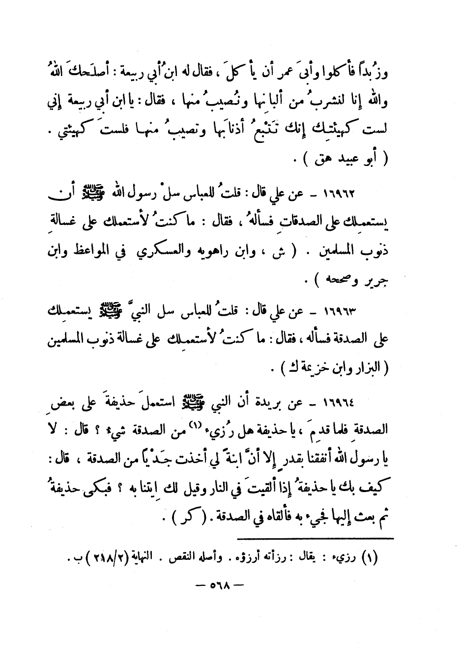 16962- عن علي قال: "قلت للعباس سل رسول الله صلى الله عليه وسلم أن يستعملك على الصدقات فسأله، فقال: " ما كنت لأستعملك على غسالة ذنوب المسلمين". "ش، وابن راهويه والعسكري في المواعظ وابن جرير وصححه".