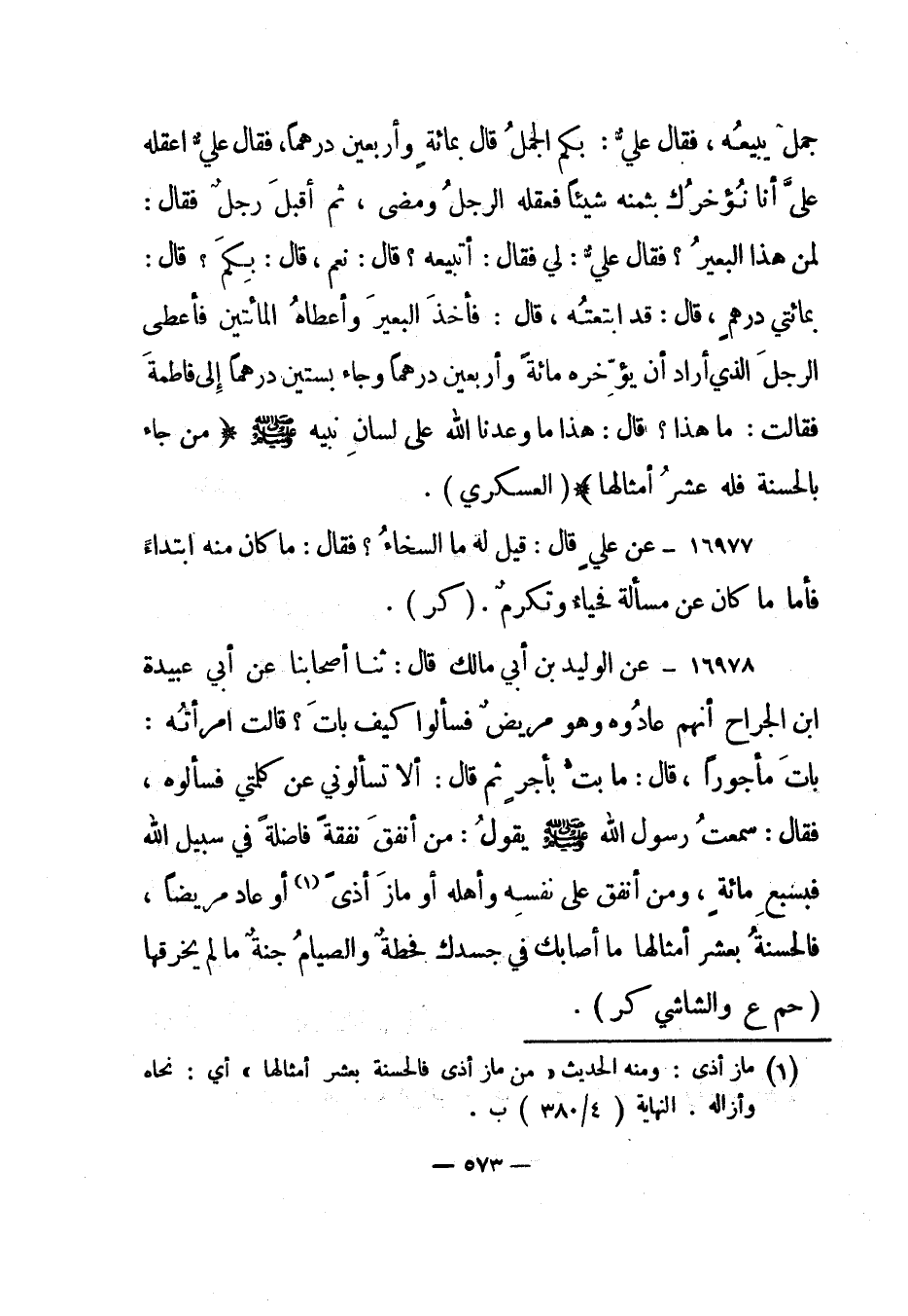 جمل يبيعه، فقال عليٌّ: بكم الجمل قال بمائة وأربعين درهما، فقال علي اعقله على أنا نؤخرك بثمنه شيئا فعقله الرجل ومضى، ثم أقبل رجل فقال: لمن هذا البعير؟ فقال علي: لي فقال: أتبيعه؟ قال: نعم، قال: بكم؟ قال بمائتي درهم، قال: قد ابتعته، قال: فأخذ البعير وأعطاه المائتين فأعطى الرجل الذي أراد أن يؤخره مائة وأربعين درهما وجاء بستين درهما إلى فاطمة فقالت: ماهذا؟ قال: هذا ما وعدنا الله على لسان نبيه صلى الله عليه وسلم {مَنْ جَاءَ بِالْحَسَنَةِ فَلَهُ عَشْرُ أَمْثَالِهَا} ". "العسكري".