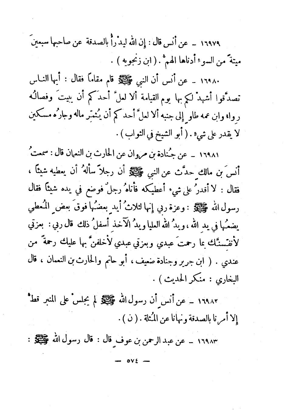 16981- عن جنادة بن مروان عن الحارث بن النعمان قال: "سمعت أنس بن مالك حدث عن النبي صلى الله عليه وسلم أن رجلا سأله أن يعطيه شيئا، فقال: لا أقدر على شيء أعطيكه فأتاه رجل فوضع في يده شيئا فقال رسول الله صلى الله عليه وسلم: وعزة ربي إنها لثلاث أيد بعضها فوق بعض المعطي يضعها في يد الله، ويد الله العليا ويد الآخذ أسفل ذلك قال ربي: بعزتي لأنفسنك بما رحمت عبدي وبعزتي عبدي لأخلفن بها عليك رحمة من عندي". "ابن جرير وجنادة ضعيف، أبو حاتم والحارث بن النعمان، قال البخاري: منكر الحديث".