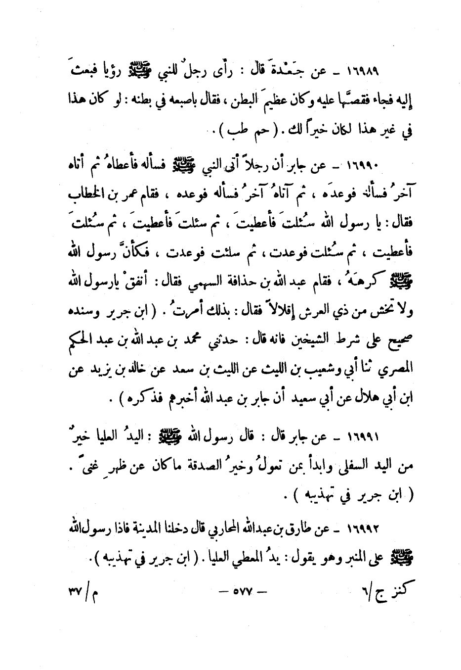 16992- عن طارق بن عبد الله المحاربي قال: "دخلنا المدينة فإذا رسول الله صلى الله عليه وسلم على المنبر وهو يقول: يد المعطي العليا". "ابن جرير في تهذيبه".