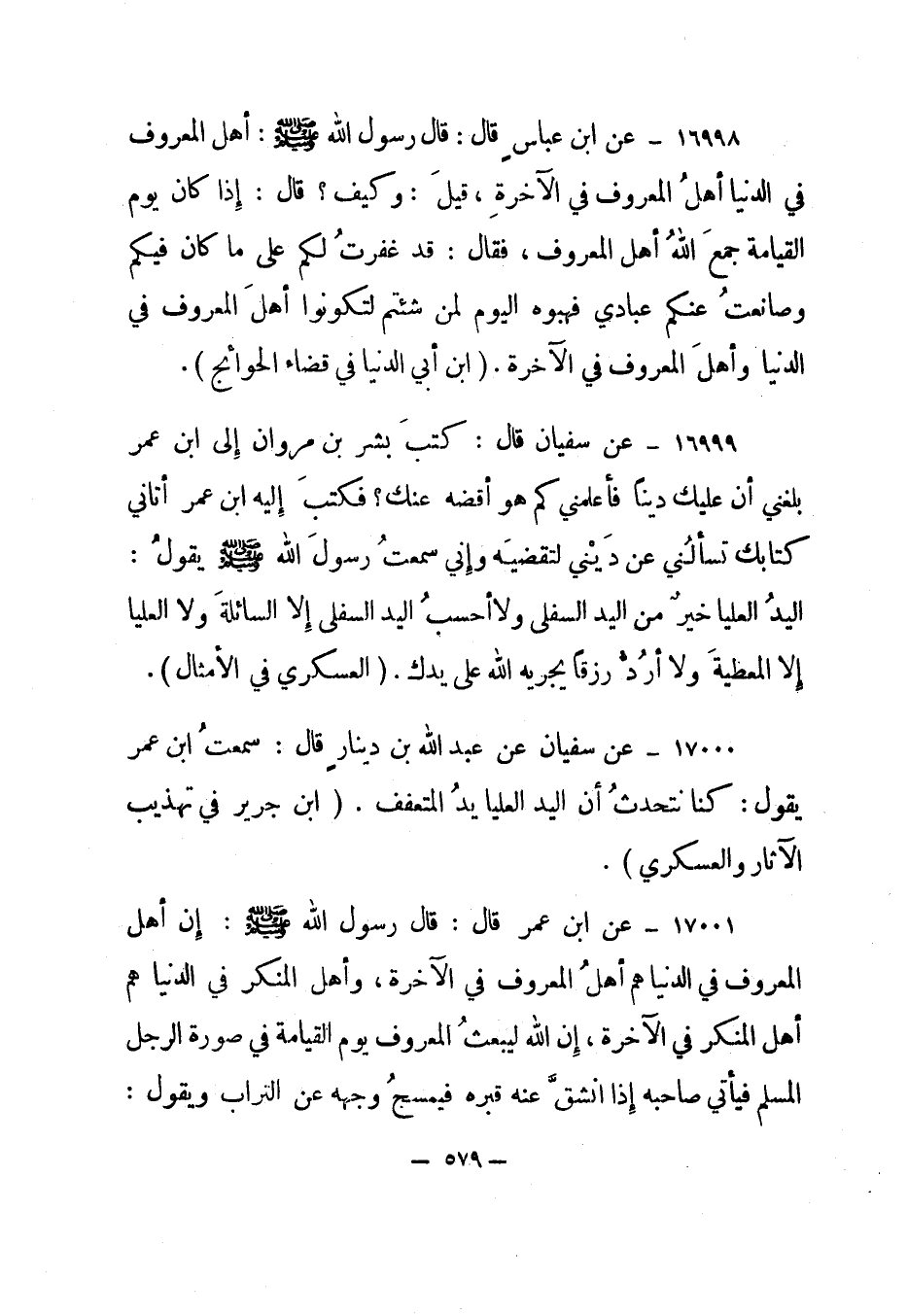 17000- عن سفيان عن عبد الله بن دينار قال: "سمعت ابن عمر يقول: كنا نتحدث أن اليد العليا يد المتعفف". "ابن جرير في تهذيب الآثار والعسكري".