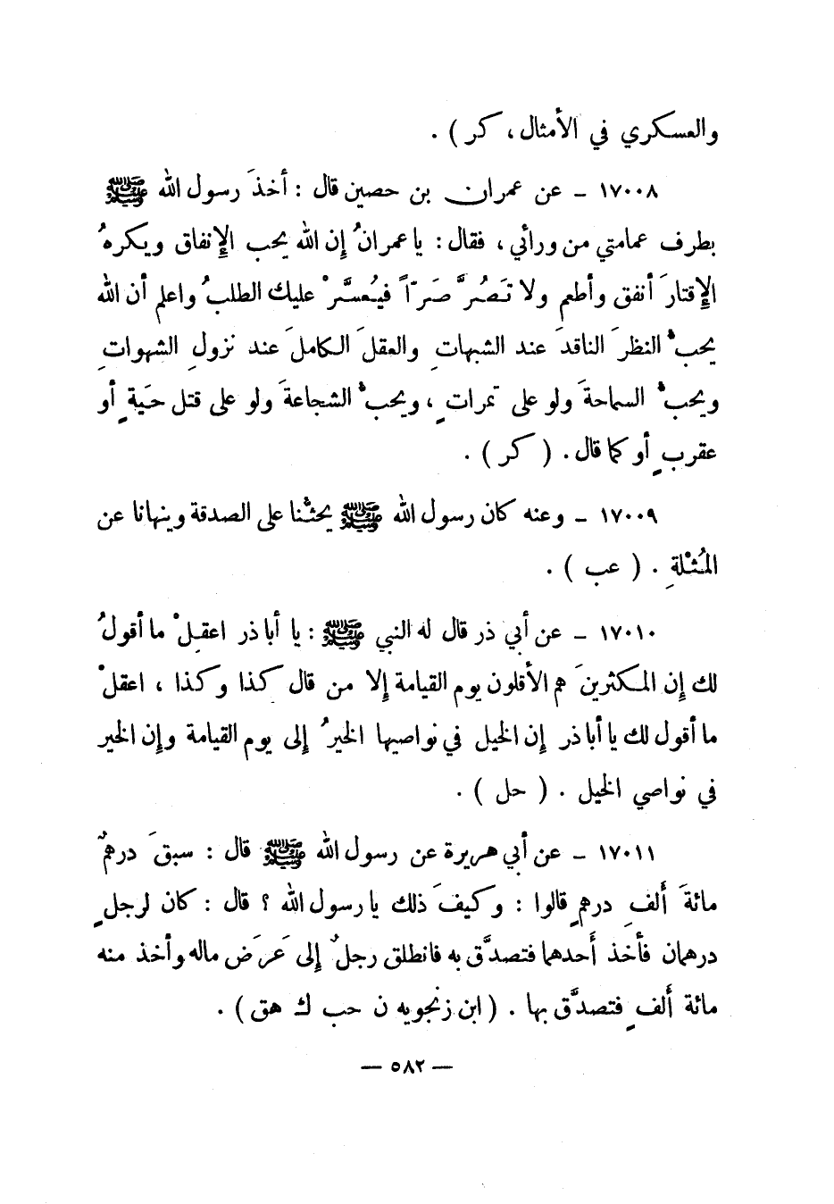 17008- عن عمران بن حصين قال: "أخذ رسول الله صلى الله عليه وسلم بطرف عمامتي من ورائي، فقال: يا عمران إن الله يحب الإنفاق ويكره الإقتار أنفق وأطعم ولا تصر صرا فيعسر عليك الطلب واعلم أن الله يحب النظر الناقد عند الشبهات والعقل الكامل عند نزول الشهوات ويحب السماحة ولو على تمرات، ويحب الشجاعة ولو على قتل حية أو عقرب أو كما قال". "كر".