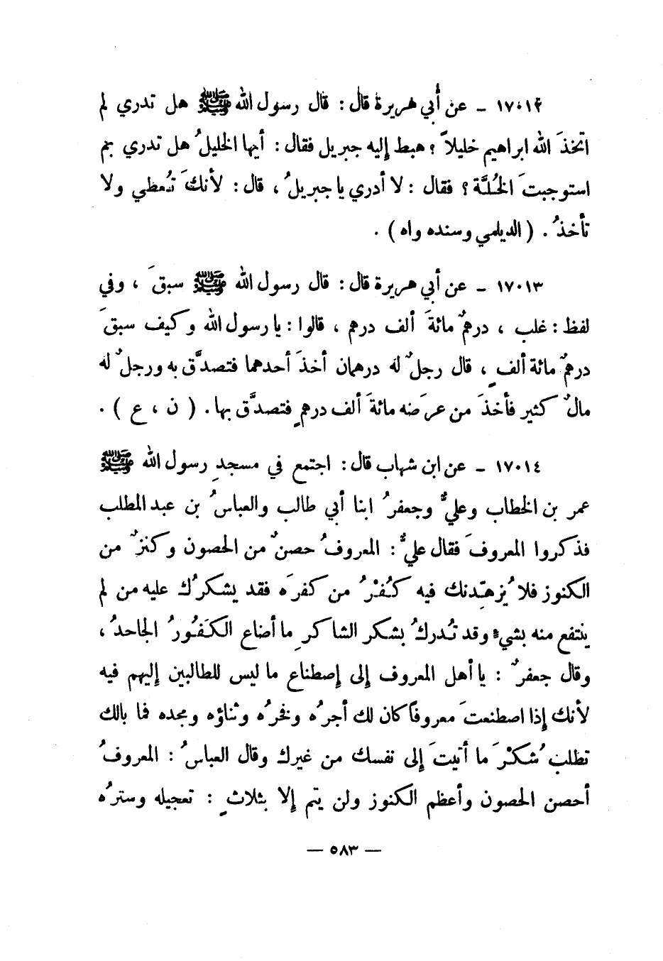 17014- عن ابن شهاب قال: "اجتمع في مسجد رسول الله صلى الله عليه وسلم عمر بن الخطاب وعلي وجعفر ابنا أبي طالب والعباس بن عبد المطلب فذكروا المعروف فقال علي: المعروف حصن من الحصون وكنز من الكنوز فلا يزهدنك فيه كفر من كفره فقد يشكرك عليه من لم ينتفع منه بشيء وقد تدرك بشكر الشاكر ما أضاع الكفور الجاحد، وقال جعفر: يا أهل المعروف إلى إصطناع ما ليس للطالبين إليهم فيه لأنك إذا اصطنعت معروفا كان لك أجره وفخره وثناؤه ومجده فما بالك تطلب شكر ما أتيت إلى نفسك من غيرك وقال العباس: المعروف أحصن الحصون وأعظم الكنوز ولن يتم إلا بثلاث: تعجيله وستره