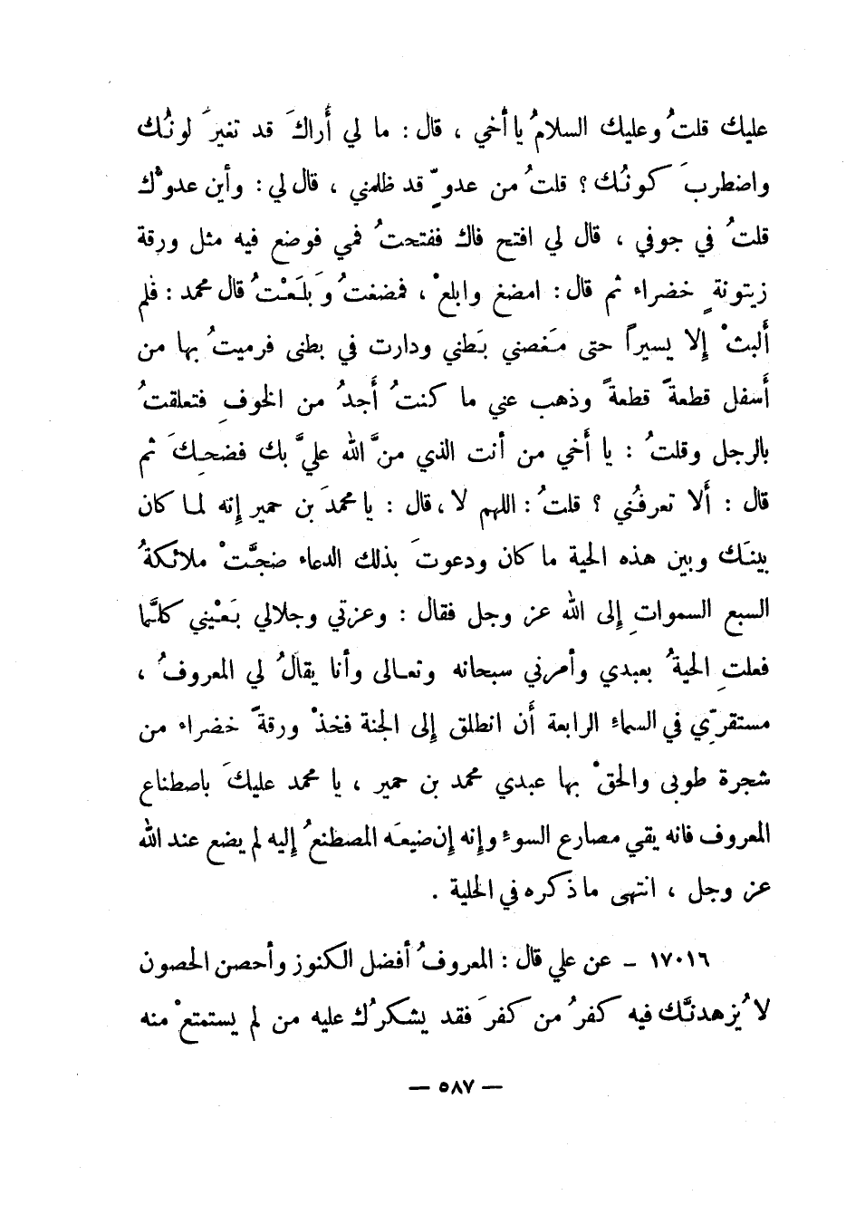 عليك قلت وعليك السلام يا أخي، قال: ما لي أراك قد تغير لونك واضطرب كونك؟ قلت من عدو ظلمني، قال لي: وأين عدوك قلت في جوفي، قال لي افتح فاك ففتحت فمي فوضع فيه مثل ورقة زيتونة خضراء ثم قال: امضغ وابلع، فمضغت وبلعت قال محمد: فلم ألبث إلا يسيرا حتى مغصني بطني ودارت في بطنى فرميت بها من أسفل قطعة قطعة وذهب عني ما كنت أجد من الخوف فتعلقت بالرجل وقلت: يا أخي من أنت الذي من الله علي بك فضحك ثم قال: ألا تعرفني؟ قلت: اللهم لا، قال: يا محمد بن حمير إنه لما كان بينك وبين هذه الحية ما كان ودعوت بذلك الدعاء ضجت ملائكة السبع السموات إلى الله عز وجل فقال: وعزتي وجلالي بعيني كلما فعلت الحية بعبدي وأمرني سبحانه وتعالى وأنا يقال لي المعروف، مستقري في السماء الرابعة أن أنطلق إلى الجنة فخذ ورقة خضراء من شجرة طوبى والحق بها عبدي محمد بن حمير، يا محمد عليك باصطناع المعروف فإنه يقي مصارع السوء وإنه إن ضيعه المصطنع إليه لم يضع عند الله عز وجل". انتهى ما ذكره في الحلية.