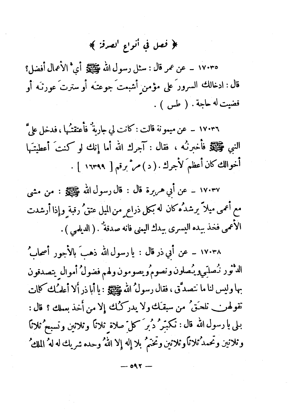 17035- عن عمر قال: " سئل رسول الله صلى الله عليه وسلم: أي الأعمال أفضل؟ قال: إدخالك السرور على مؤمن أشبعت جوعته أو سترت عورته أو قضيت له حاجة". "طس".