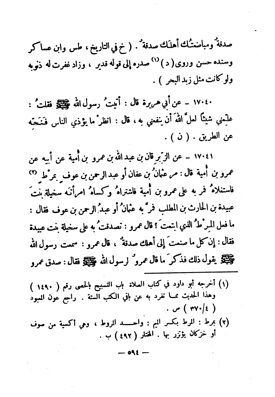 17041- عن الزبرقان بن عبد الله بن عمرو بن أمية عن أبيه عن عمرو بن أمية قال: "مر عثمان بن عفان أو عبد الرحمن بن عوف بمرط 2 فاستغلاه فمر به على عمرو بن أمية فاشتراه وكساه امرأته سخيلة بنت عبيدة بن الحارث بن المطلب فمر به عثمان أو عبد الرحمن بن عوف فقال: ما فعل المرط الذي ابتعت؟ قال عمرو: تصدقت به على سخيلة بنت عبيدة فقال: إن كل ما صنعت إلى أهلك صدقة، قال عمرو: سمعت رسول الله صلى الله عليه وسلم يقول ذلك فذكر ما قال عمرو لرسول الله صلى الله عليه وسلم فقال: صدق عمرو