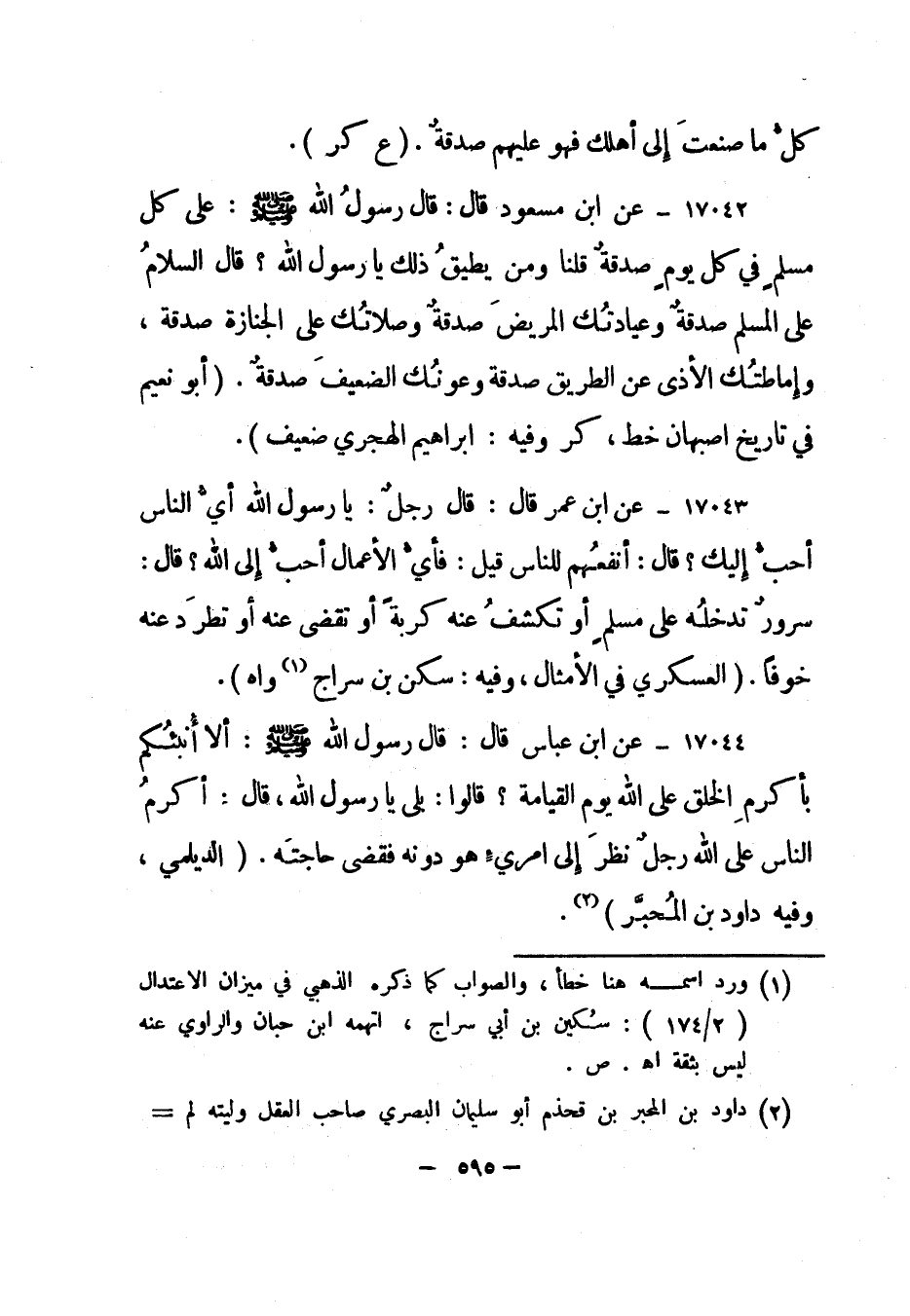17042- عن ابن مسعود قال: قال رسول الله صلى الله عليه وسلم: "على كل مسلم في كل يوم صدقة قلنا ومن يطيق ذلك يا رسول الله؟ قال السلام على المسلم صدقة وعيادتك المريض صدقة وصلاتك على الجنازة صدقة، وإماطتك الأذى عن الطريق صدقة وعونك الضعيف صدقة". "أبو نعيم في تاريخ أصبهان خط، كر وفيه: إبراهيم الهجري ضعيف".