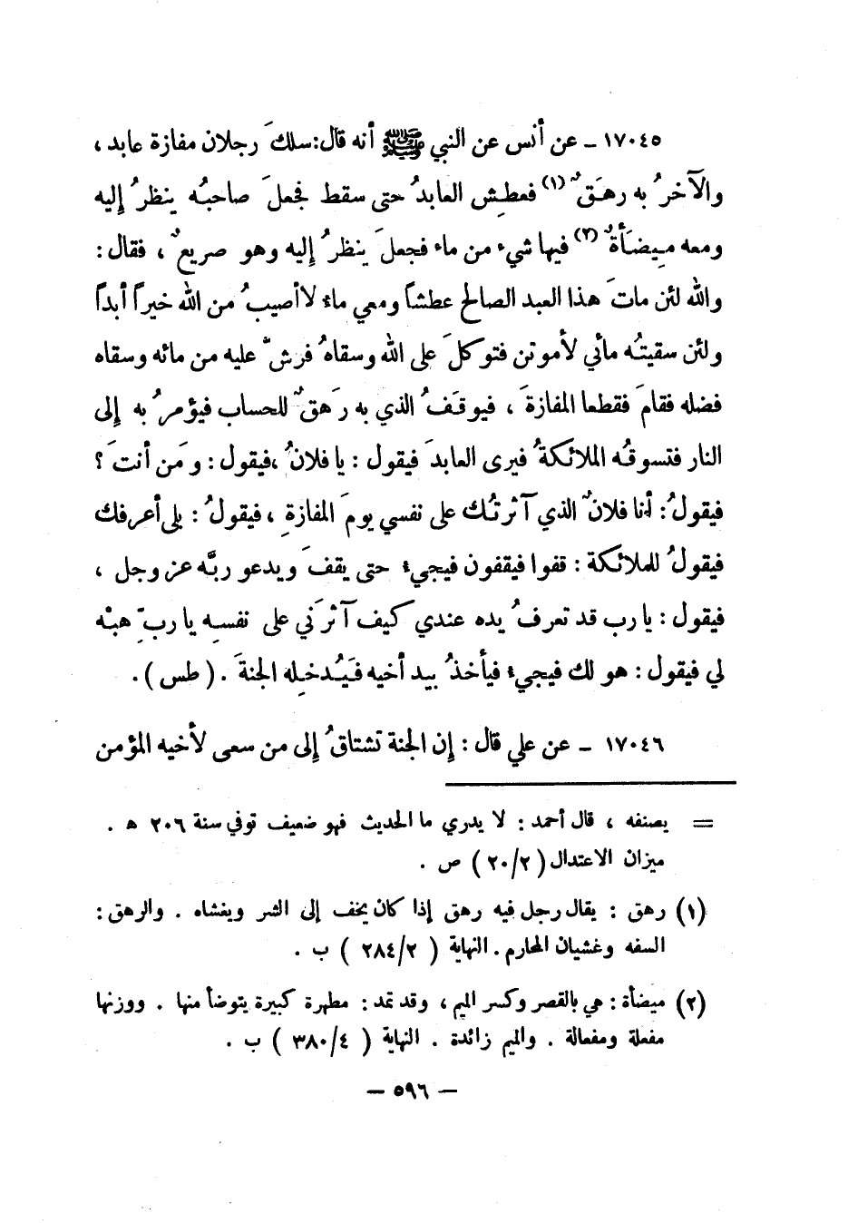 17045- عن أنس عن النبي صلى الله عليه وسلم أنه قال: "سلك رجلان مفازة عابد، والآخر به رهق 1 فعطش العابد حتى سقط فجعل صاحبه ينظر إليه ومعه ميضأة 2 فيها شيء من ماء فجعل ينظر إليه وهو صريع، فقال: والله لئن مات هذا العبد الصالح عطشا ومعي ماء لا أصيب من الله خيرا أبدا ولئن سقيته مائي لأموتن فتوكل على الله وسقاه فرش عليه من مائه وسقاه فضله فقام فقطعا المفازة، فيوقف الذي به رهق للحساب فيؤمر به إلى النار فتسوقه الملائكة فيرى العابد فيقول: يا فلان، فيقول: ومن أنت؟ فيقول: أنا فلان الذي آثرتك على نفسي يوم المفازة، فيقول: بلى أعرفك فيقول للملائكة: قفوا فيقفون فيجيء حتى يقف ويدعو ربه عز وجل، فيقول: يا رب قد تعرف يده عندي كيف آثرني على نفسه يا رب هبه لي فيقول: هو لك فيجيء فيأخذ بيد أخيه فيدخله الجنة". "طس".