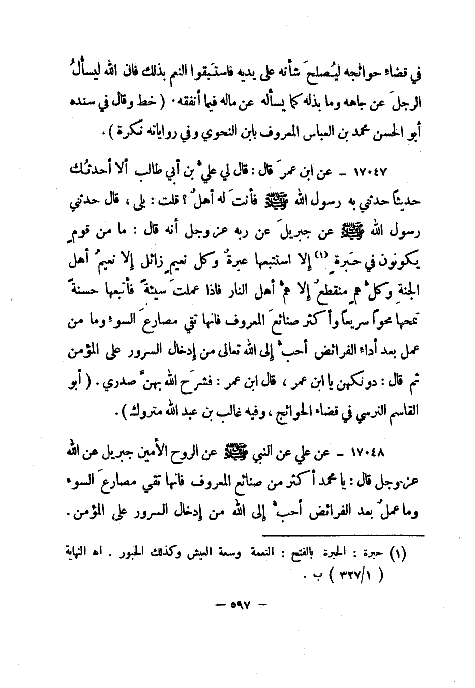 17047- عن ابن عمر قال: "قال لي علي بن أبي طالب ألا أحدثك حديثا حدثني به رسول الله صلى الله عليه وسلم فأنت له أهل؟ قلت: بلى، قال حدثني رسول الله صلى الله عليه وسلم عن جبريل عن ربه عز وجل أنه قال: ما من قوم يكونون في حبرة 1 إلا استتبعها عبرة وكل نعيم زائل إلا نعيم أهل الجنة وكل هم منقطع إلا هم أهل النار فإذا عملت سيئة فأتبعها حسنة تمحها محوا سريعا وأكثر صنائع المعروف فإنها تقي مصارع السوء وما من عمل بعد أداء الفرائض أحب إلى الله تعالى من إدخال السرور على المؤمن ثم قال: دونكهن يا ابن عمر، قال ابن عمر: فشرح الله بهن صدري". "أبو القاسم النرسي في قضاء الحوائج، وفيه غالب بن عبد الله متروك".