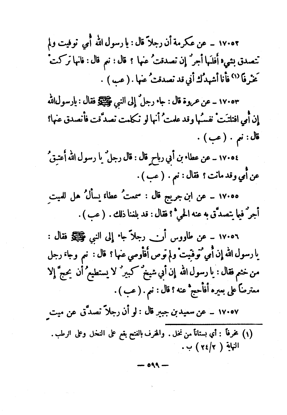 17052- عن عكرمة أن رجلا قال: " يا رسول الله أمي توفيت ولم تتصدق بشيء أفلها أجر إن تصدقت عنها؟ قال: نعم قال: فإنها تركت مخرفا 1 فأنا أشهدك أني قد تصدقت عنها". "عب".