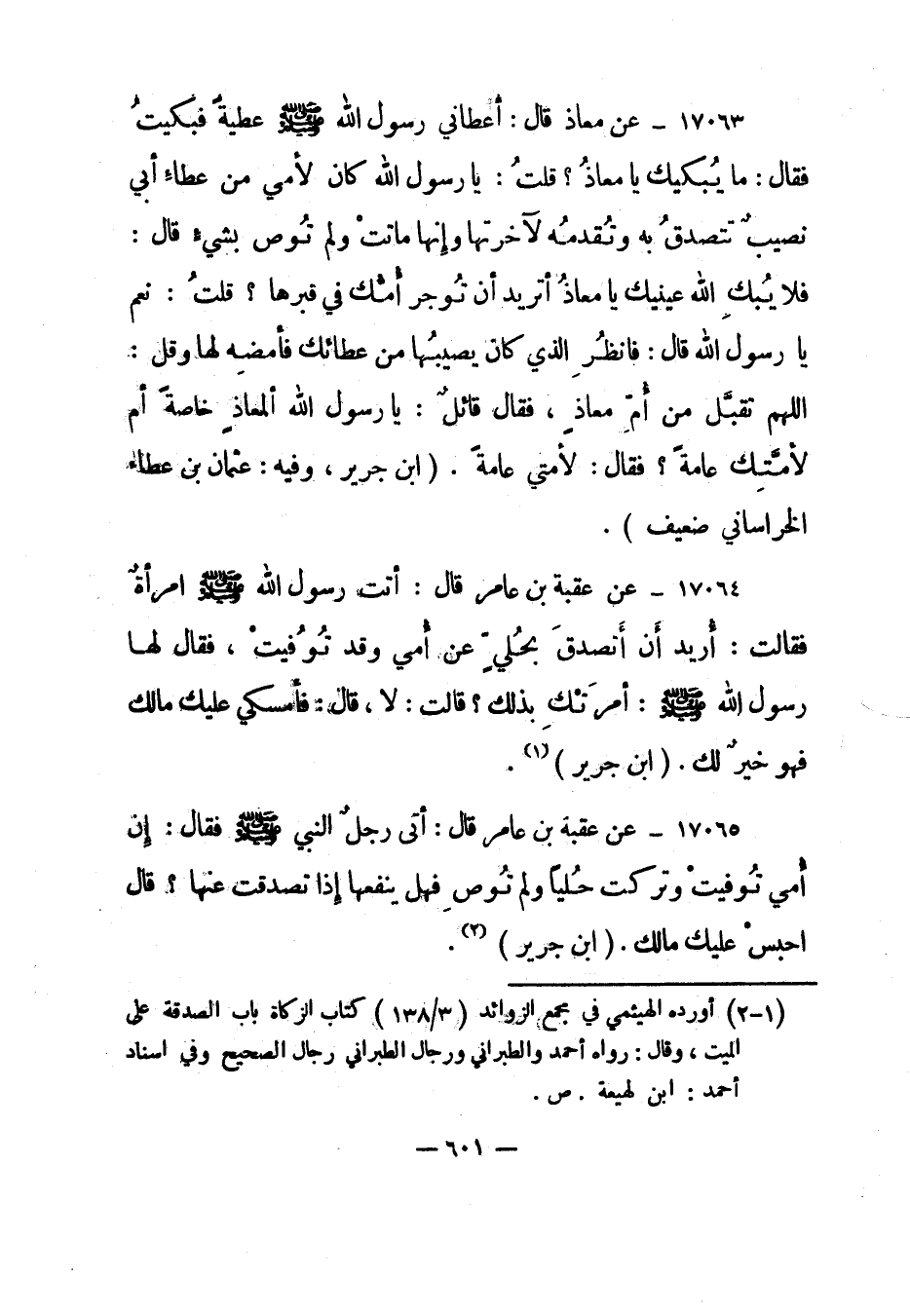 17064- عن عقبة بن عامر قال: "أتت رسول الله صلى الله عليه وسلم امرأة فقالت: أريد أن أتصدق بحلي عن أمي وقد توفيت، فقال لها رسول الله صلى الله عليه وسلم: أمرتك بذلك؟ قالت: لا، قال: فأمسكي عليك مالك فهو خير لك". "ابن جرير" 1.