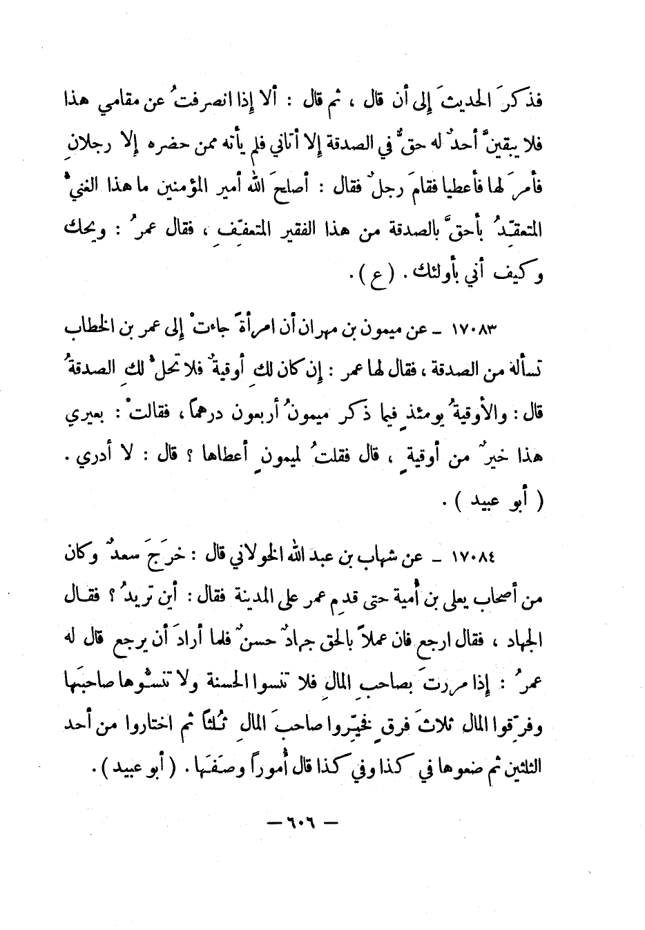 17083- عن ميمون بن مهران "أن امرأة جاءت إلى عمر بن الخطاب تسأله من الصدقة، فقال لها عمر: إن كان لك أوقية فلا تحل لك الصدقة قال: والأوقية يومئذ فيما ذكر ميمون أربعون درهما، فقالت: بعيري هذا خير من أوقية، قال فقلت لميمون أعطاها؟ قال: لا أدري". "أبو عبيد".
