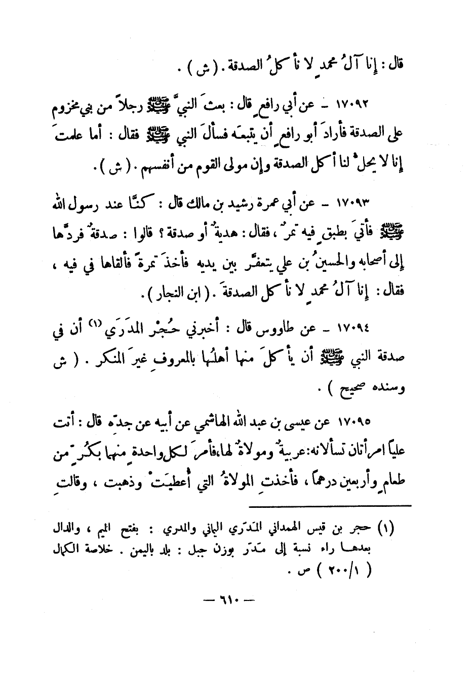 17094- عن طاووس قال: "أخبرني حجر المدري 1 أن في صدقة النبي صلى الله عليه وسلم أن يأكل منها أهلها بالمعروف غير المنكر". "ش وسنده صحيح".