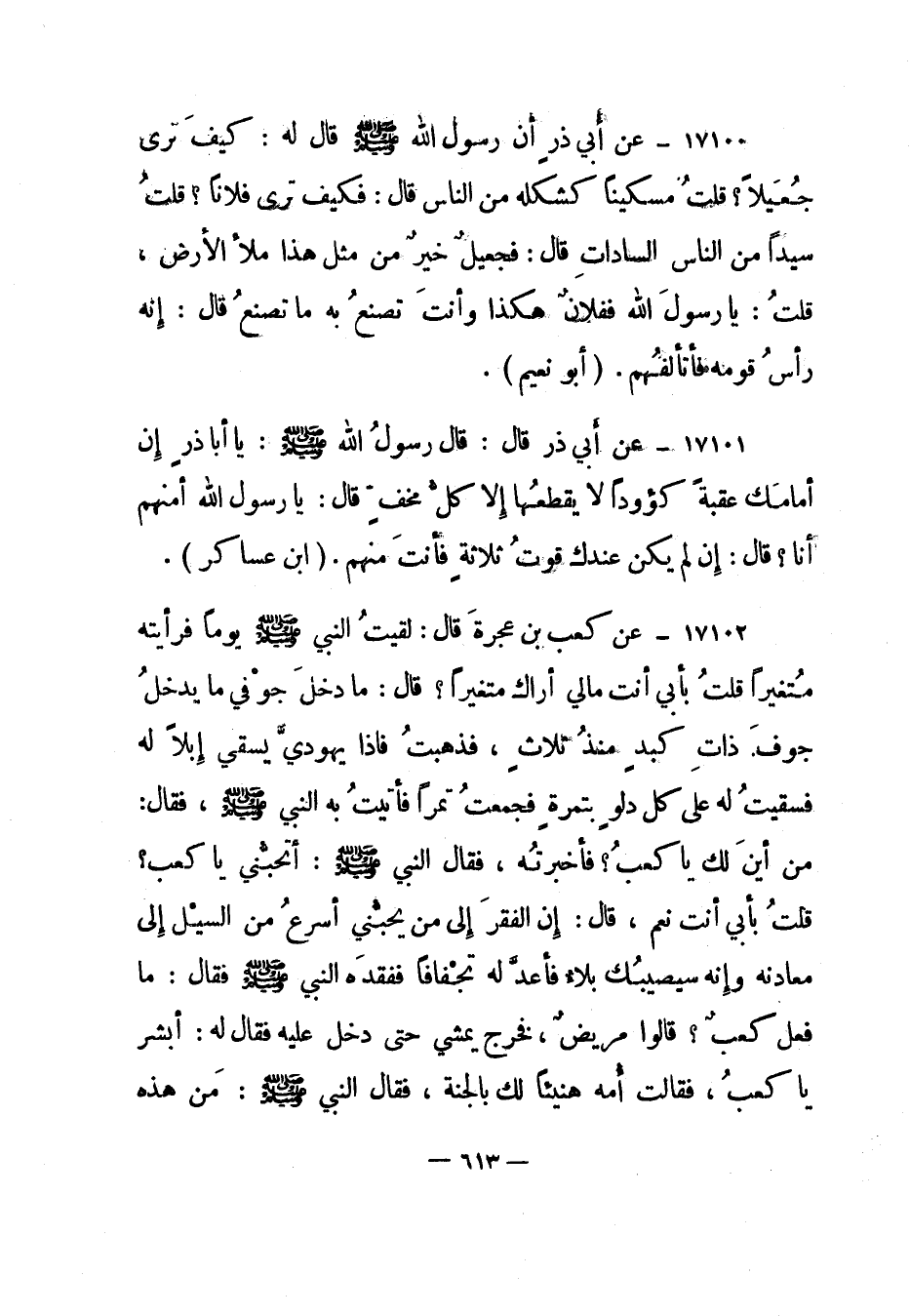 17100- عن أبي ذر أن رسول الله صلى الله عليه وسلم قال له: "كيف ترى جعيلا؟ قلت مسكينا كشكله من الناس قال: فكيف ترى فلانا؟ قلت سيدا من الناس السادات قال: فجعيل خير من مثل هذا ملأ الأرض، قلت: يا رسول الله ففلان هكذا وأنت تصنع به ما تصنع قال: إنه رأس قومه فأتألفهم". "أبو نعيم".