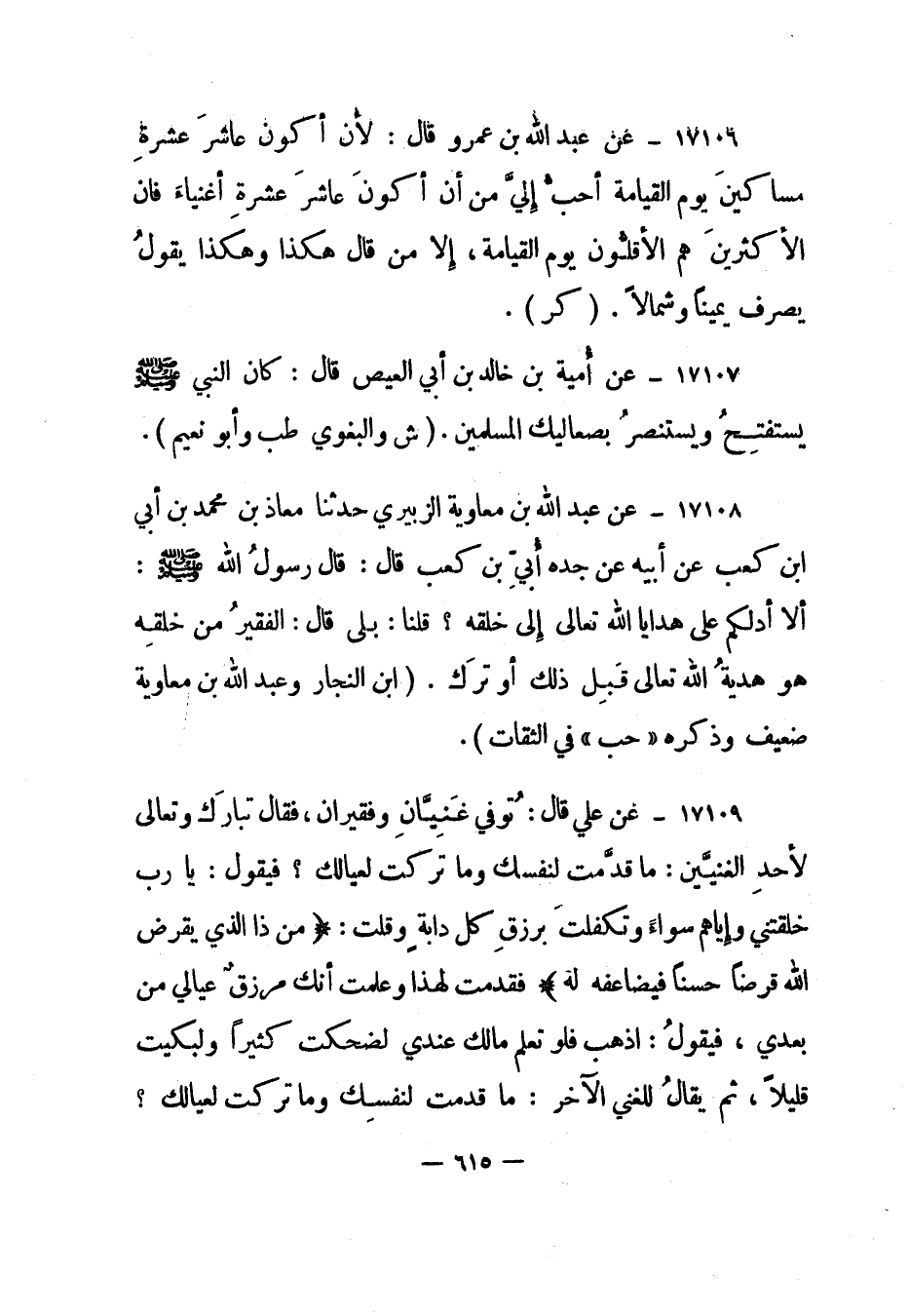 17106- عن عبد الله بن عمرو قال: "لأن أكون عاشر عشرة مساكين يوم القيامة أحب إلي من أن أكون عاشر عشرة أغنياء فإن الأكثرين هم الأقلون يوم القيامة، إلا من قال هكذا وهكذا يقول يصرف يمينا وشمالا". "كر".