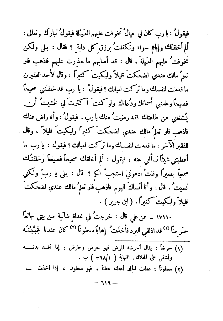 فيقول: "يا رب كان لي عيال تخوفت عليهم العيلة" فيقول تبارك وتعالى: "ألم أخلقك وإياهم سواء وتكفلت برزق كل دابة؟ " فقال: "بلى ولكن تخوفت عليهم العيلة"، قال: "قد أصابهم ما حذرت عليهم فاذهب فلو تعلم مالك عندي لضحكت قليلا ولبكيت كثيرا"، وقال لأحد الفقيرين: "ما قدمت لنفسك وما تركت لعيالك؟ " فيقول: "يا رب قد خلقتني صحيحا فصيحا وعلمتني أسماءك ودعاءك ولو كنت أكثرت لي لخشيت أن يشغلني عن طاعتك فقد رضيت عنك يا رب"، فيقول: "وأنا راض عنك فاذهب فلو تعلم مالك عندي لضحكت كثيرا ولبكيت قليلا"، وقال للفقير الآخر: "ما قدمت لنفسك وما تركت لعيالك؟ " فيقول: "يا رب ما أعطيتني شيئا تسألني عنه"، فيقول: "ألم أخلقك صحيحا فصيحا وخلقتك سميعا بصيرا" وقلت: "ادعوني استجب لكم؟ " قال: "بلى يا رب ولكني نسيت". قال: "وأنا أنساك اليوم، فاذهب فلو تعلم مالك عندي لضحكت قليلا ولبكيت كثيرا". "ابن جرير".