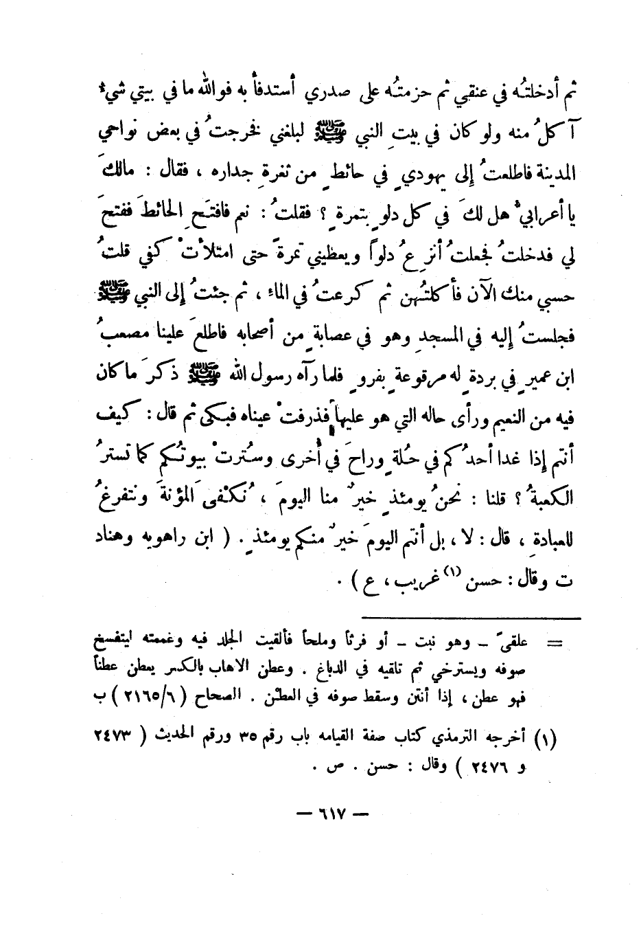 (1) أخرجه الترمذي كتاب صفة القيامة باب رقم 35 ورقم الحديث "2473 و 2476" وقال: حسن. ص.