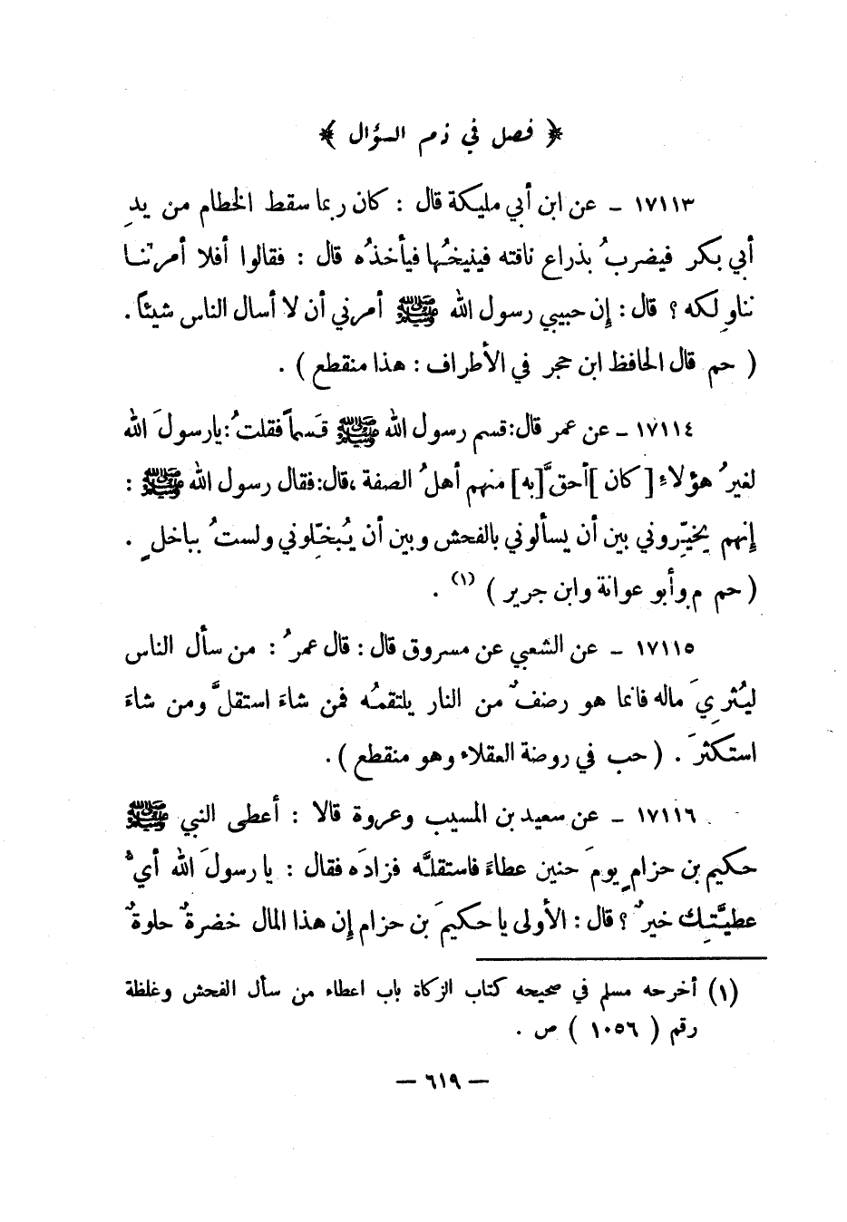 (1) أخرجه مسلم في صحيحه كتاب الزكاة باب إعطاء من سأل الفحش وغلظة رقم "1056" ص.