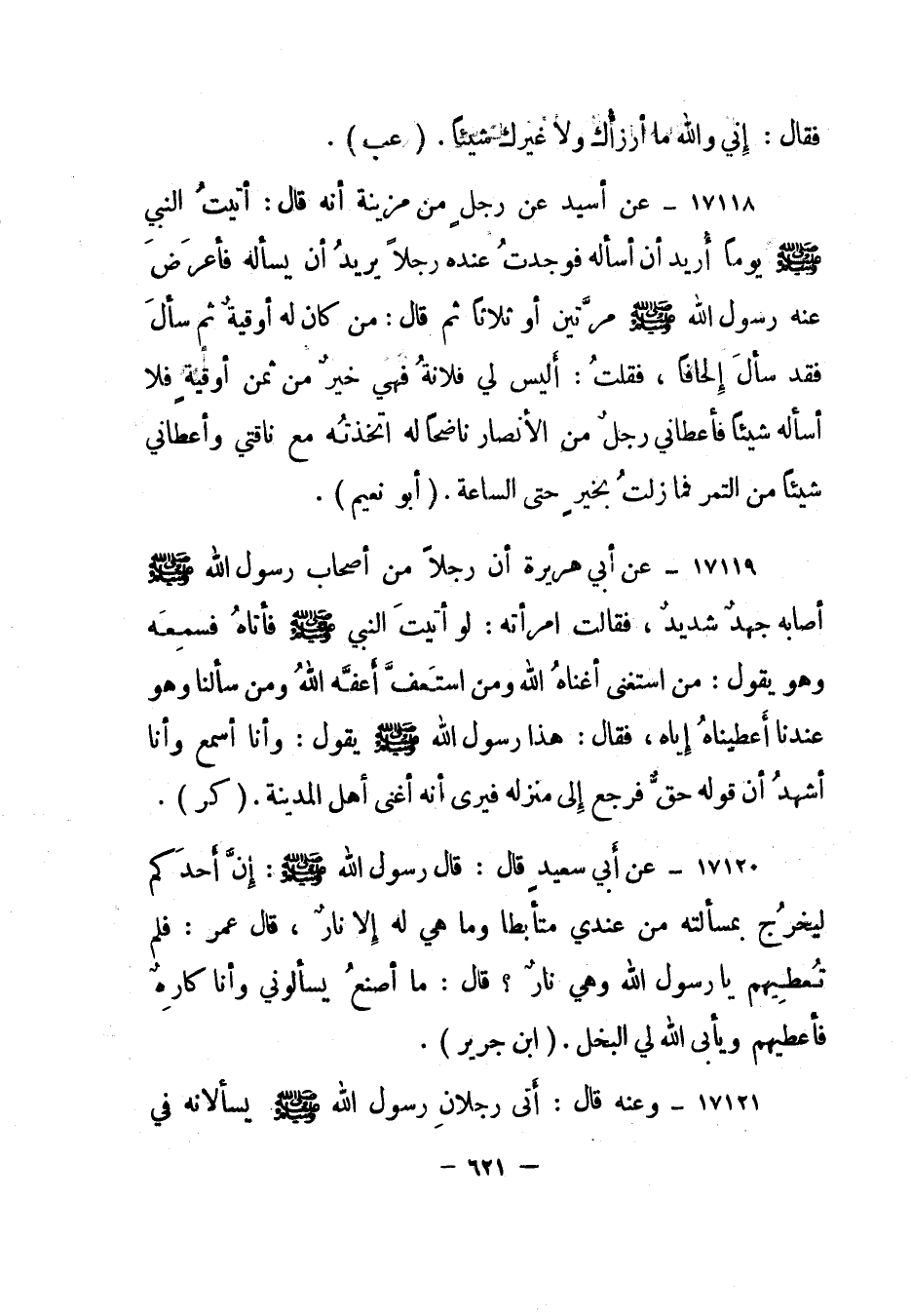 17120- عن أبي سعيد قال: قال رسول الله صلى الله عليه وسلم: "إن أحدكم ليخرج بمسألته من عندي متأبطا وما هي له إلا نار، قال عمر: فلم تعطيهم يا رسول الله وهي نار؟ قال: ما أصنع يسألوني وأنا كاره فأعطيهم ويأبى الله لي البخل". "ابن جرير".