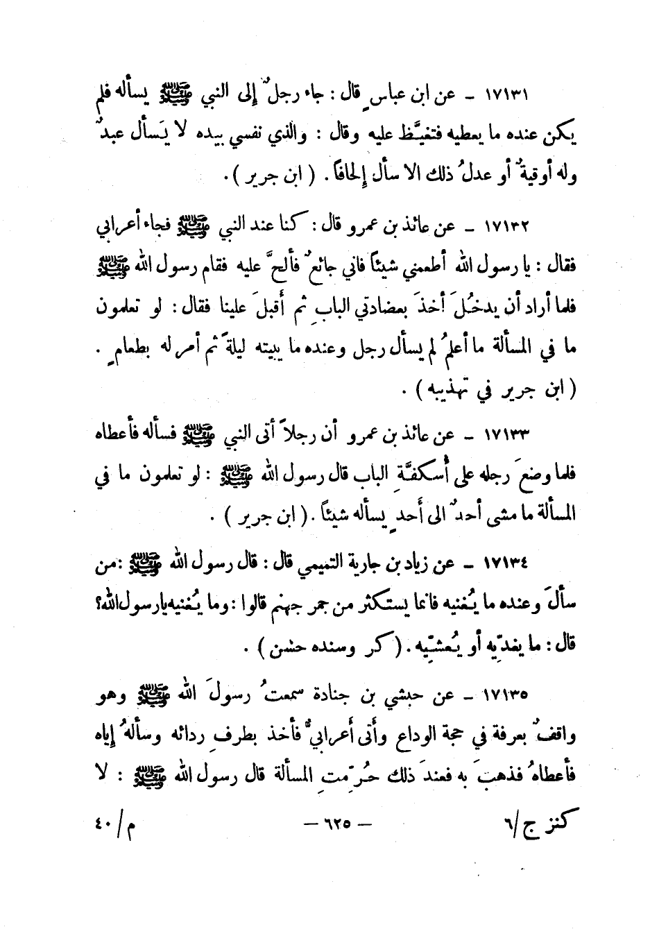 17131- عن ابن عباس قال: "جاء رجل إلى النبي صلى الله عليه وسلم يسأله فلم يكن عنده ما يعطيه فتغيظ عليه وقال: والذي نفسي بيده لا يسأل عبد وله أوقية أو عدل ذلك إلا سأل إلحافا". "ابن جرير".