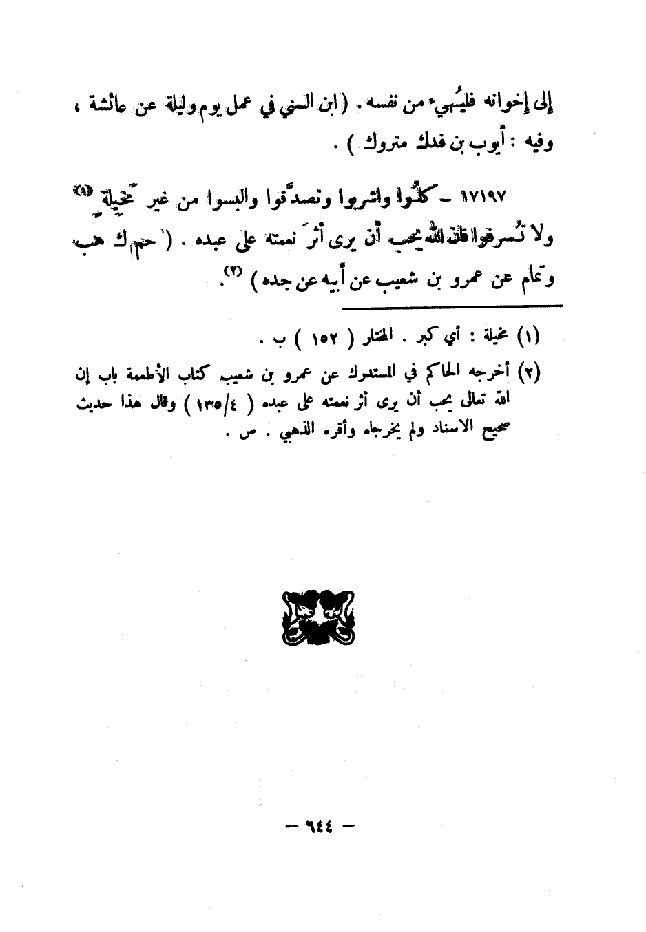 17197- " كلوا واشربوا وتصدقوا والبسوا من غير مخيلة 1 ولا تسرفوا فإن الله يحب أن يرى أثر نعمته على عبده". "حم ك هب وتمام عن عمرو بن شعيب عن أبيه عن جده" 2.