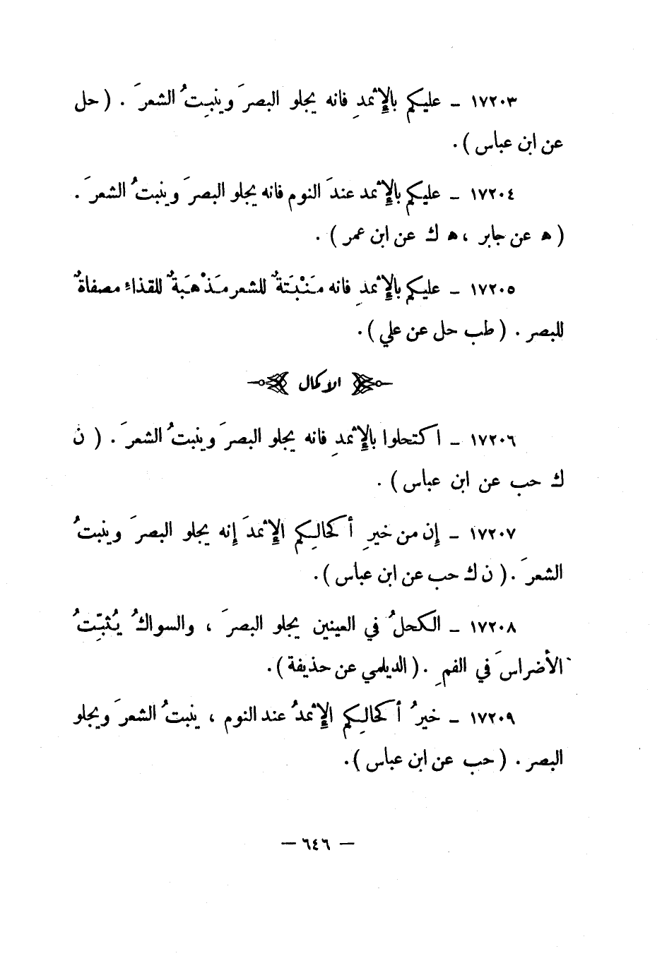 17205- "عليكم بالإثمد فإنه منبتة للشعر مذهبة للقذاء مصفاة للبصر". "طب حل عن علي".