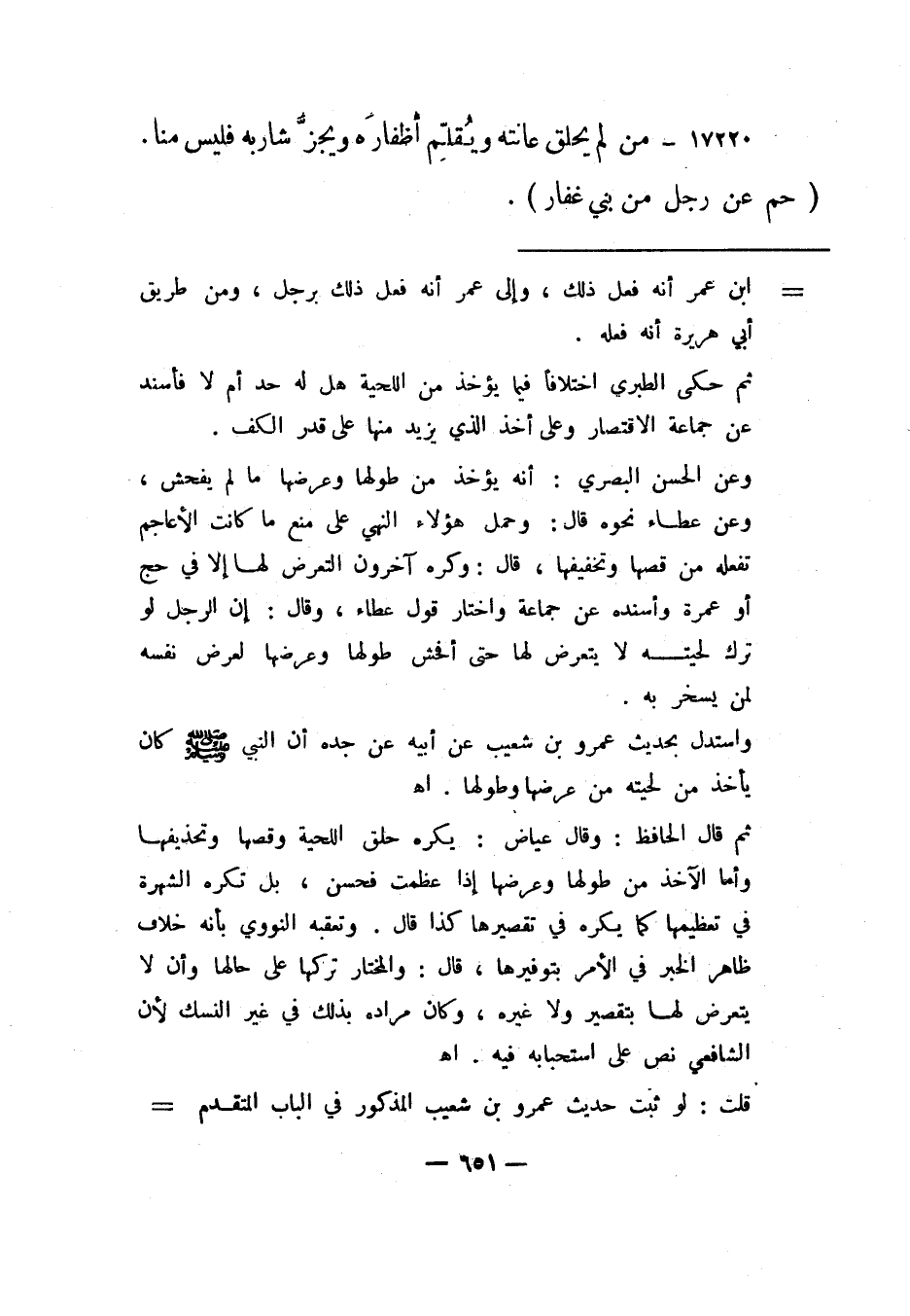 = ابن عمر أنه فعل ذلك، وإلى عمر أنه فعل ذلك برجل، ومن طريق أبي هريرة أنه فعله. ثم حكى الطبري اختلافا فيما يؤخذ من اللحية هل له حد أم لا فأسند عن جماعة الاقتصار وعلى أخذ الذي يزيد منها على قدر الكف. وعن الحسن البصري: أنه يؤخذ من طولها وعرضها ما لم يفحش، وعن عطاء نحوه قال: وحمل هؤلاء النهي على منع ما كانت الأعاجم تفعله من قصها وتخفيفها، قال: وكره آخرون التعرض لها إلا في حج أو عمرة وأسنده عن جماعة واختار قول عطاء، وقال: إن الرجل لو ترك لحيته لا يتعرض لها حتى أفحش طولها وعرضها لعرض نفسه لمن يسخر به. واستدل بحديث عمرو بن شعيب عن أبيه عن جده أن النبي صلى الله عليه وسلم كان يأخذ من لحيته من عرضها وطولها. انتهى. ثم قال الحافظ: وقال عياض: يكره حلق اللحية وقصها وتحذيفها وأما الآخذ من طولها وعرضها إذا عظمت فحسن، بل تكره الشهرة في تعظيمها كما يكره في تقصيرها كذا قال. وتعقبه النووي بأنه خلاف ظاهر الخبر في الأمر بتوفيرها، قال: والمختار تركها على حالها وأن لا يتعرض لها بتقصير ولا غيره، وكان مراده بذلك في غير النسك لأن الشافعي نص على استحبابه فيه. اهـ. قلت: لو ثبت حديث عمرو بن شعيب المذكور في الباب المتقدم =