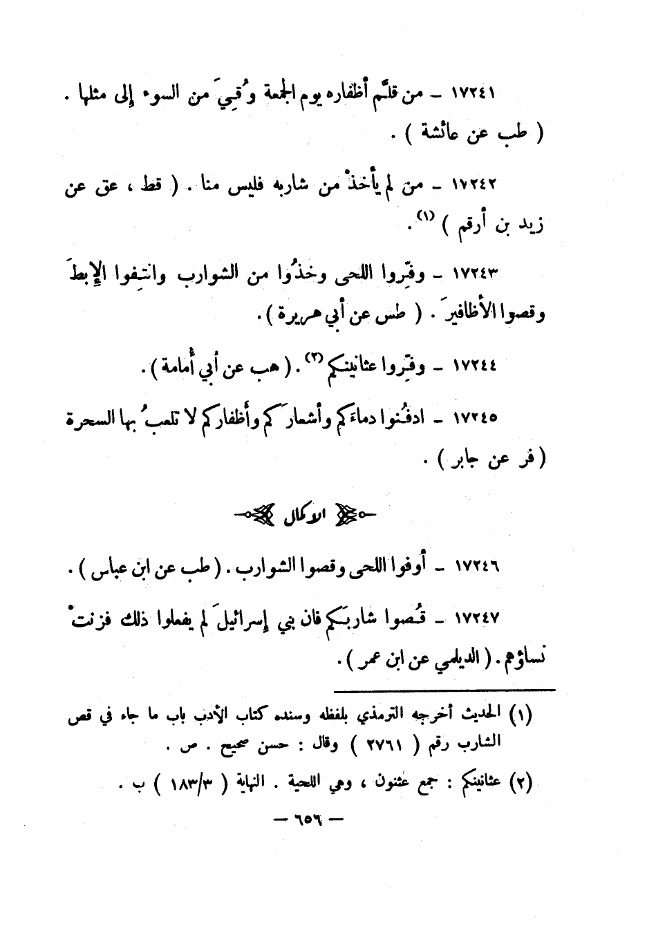 17242- "من لم يأخذ من شاربه فليس منا". "قط، عق عن زيد بن أرقم" 1.