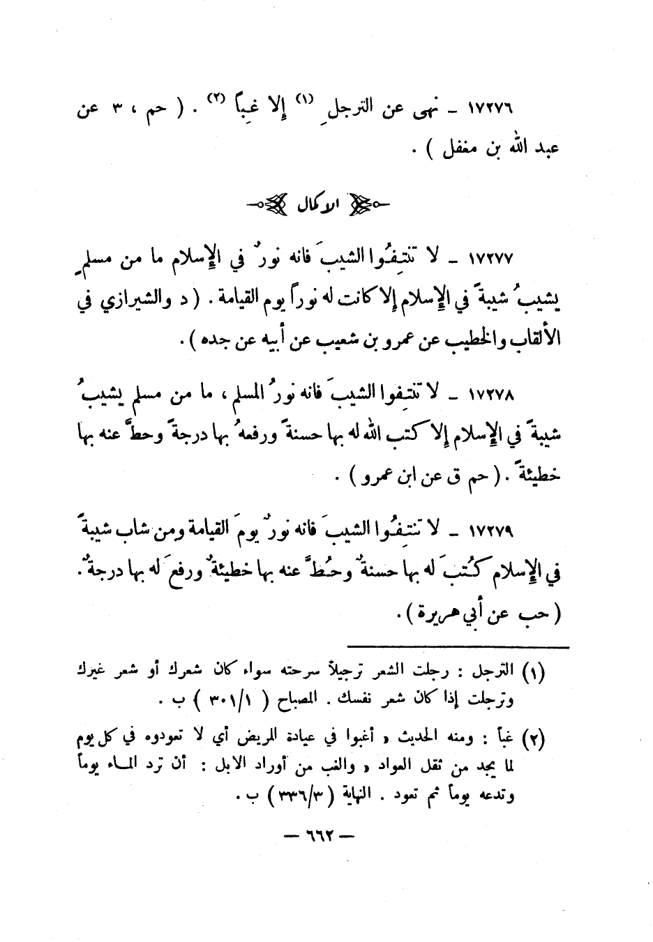 17278- "لا تنتفوا الشيب فإنه نور المسلم، ما من مسلم يشيب شيبة في الإسلام إلا كتب الله له بها حسنة ورفعه بها درجة وحط عنه بها خطيئة". "حم ق عن ابن عمرو".