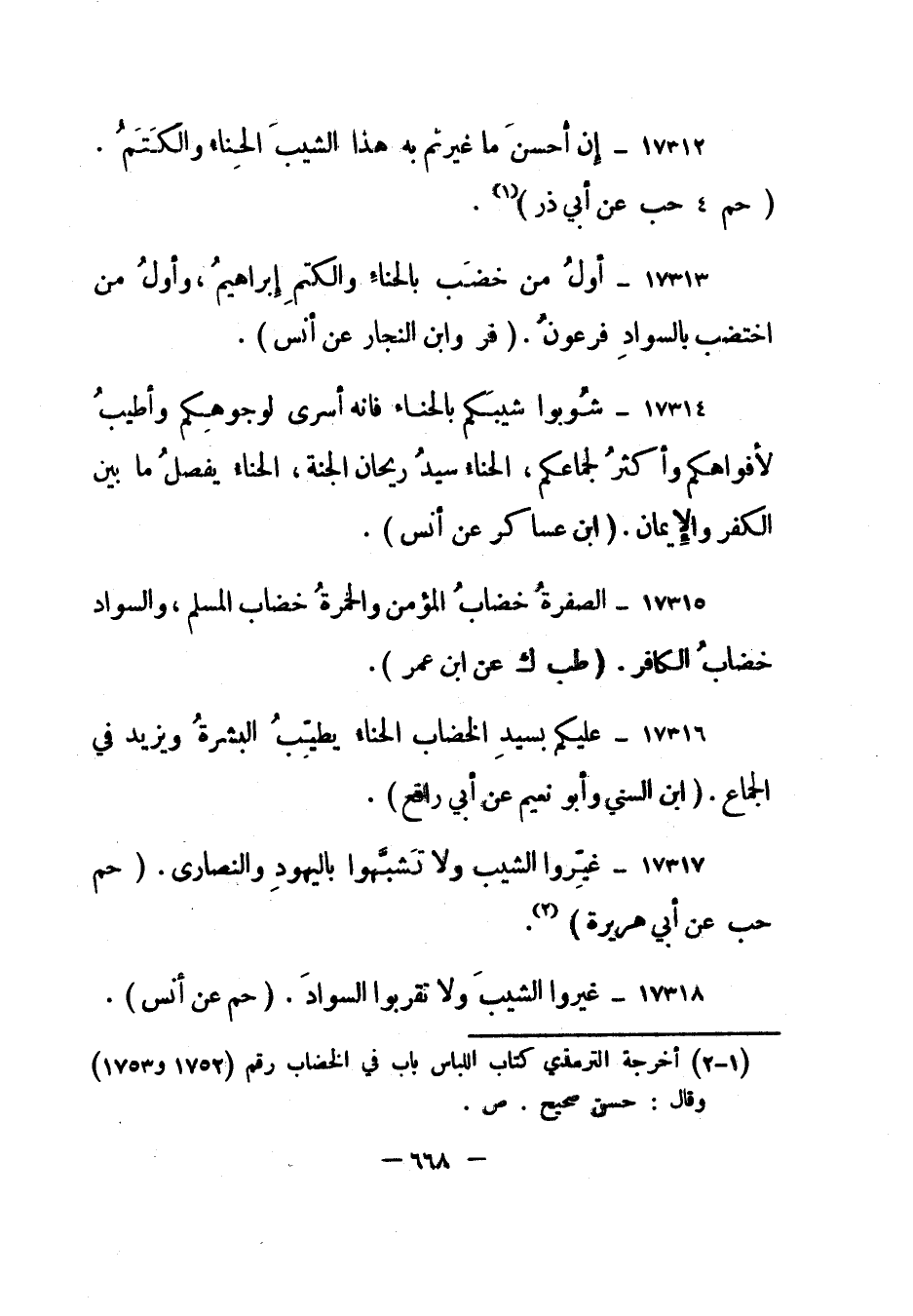17312- "إن أحسن ما غيرتم به هذا الشيب الحناء والكتم". "حم 4 حب عن أبي ذر" 1.