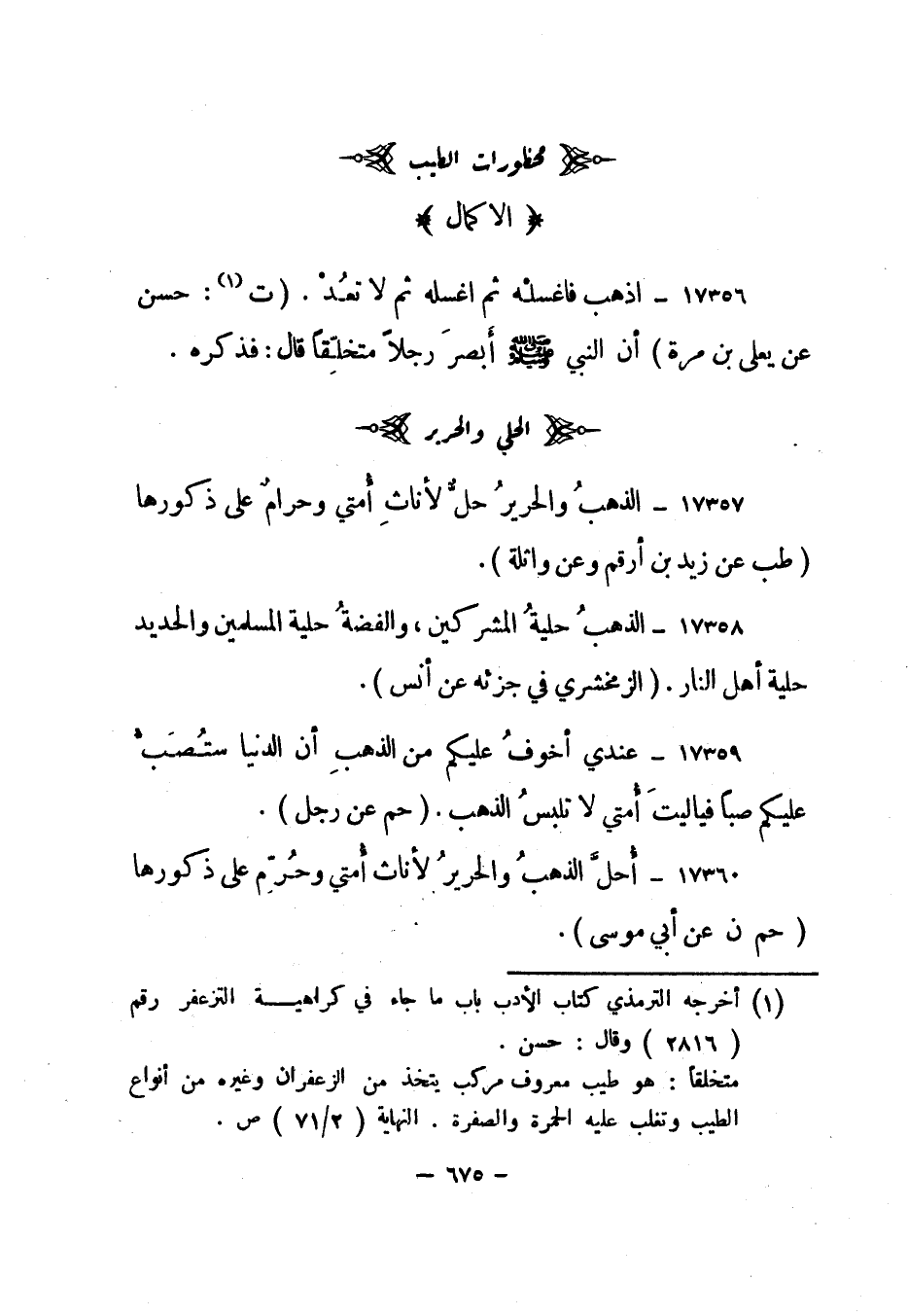 17360- "أحل الذهب والحرير لأناث أمتي وحرم على ذكورها". "حم ن عن أبي موسى".