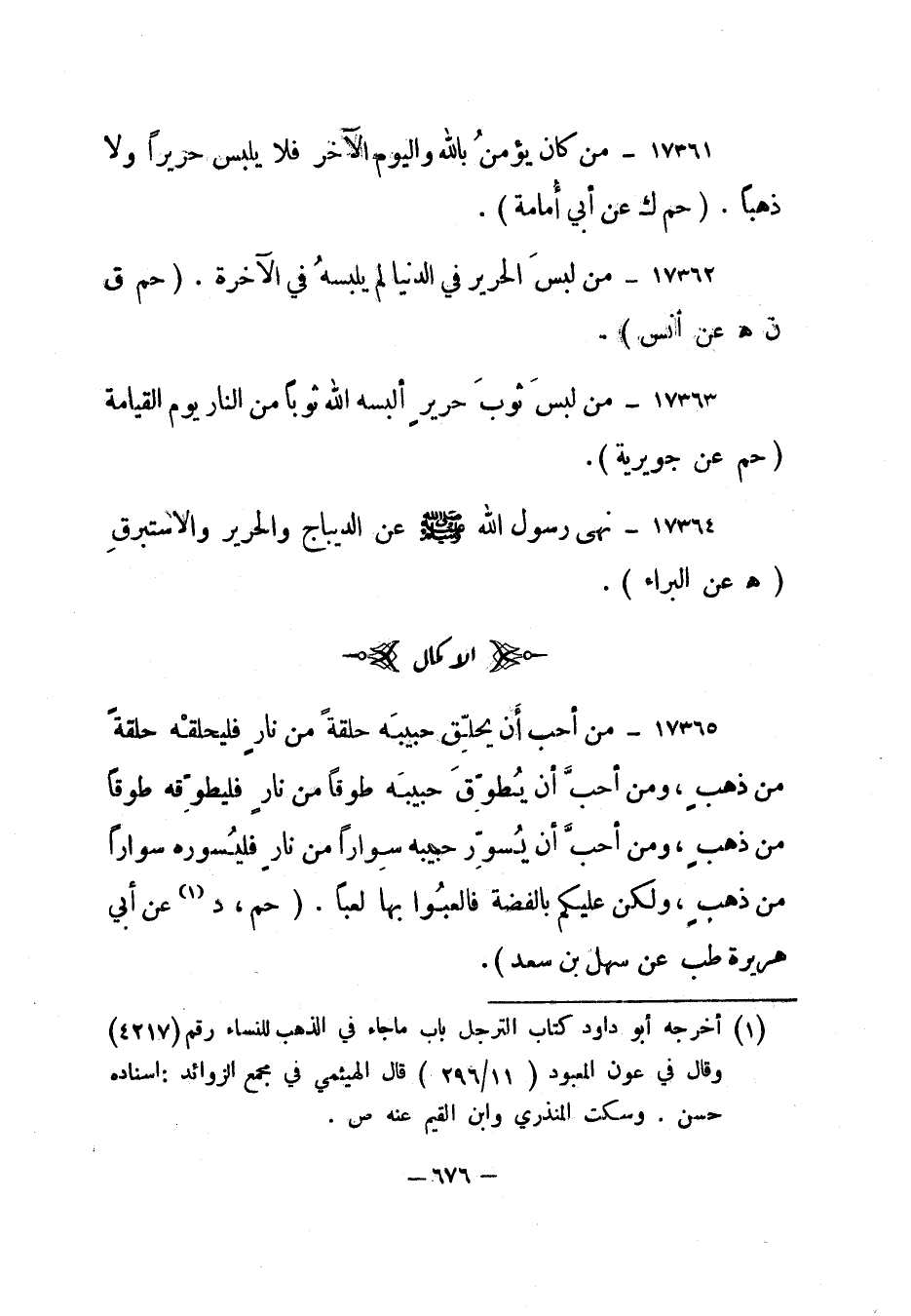 (1) أخرجه أبو داود كتاب الترجل باب ما جاء في الذهب للنساء رقم "4217" وقال في عون المعبود "11/296" قال الهيثمي في مجمع الزوائد: إسناده حسن. وسكت المنذري وابن القيم عنه ص.
