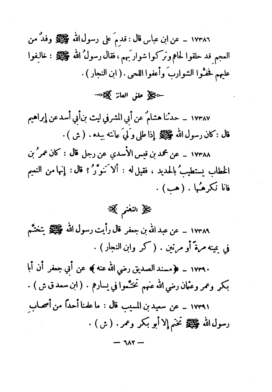 17391- عن سعيد بن المسيب قال: "ما علمنا أحدا من أصحاب رسول الله صلى الله عليه وسلم تختم إلا أبو بكر وعمر". "ش".