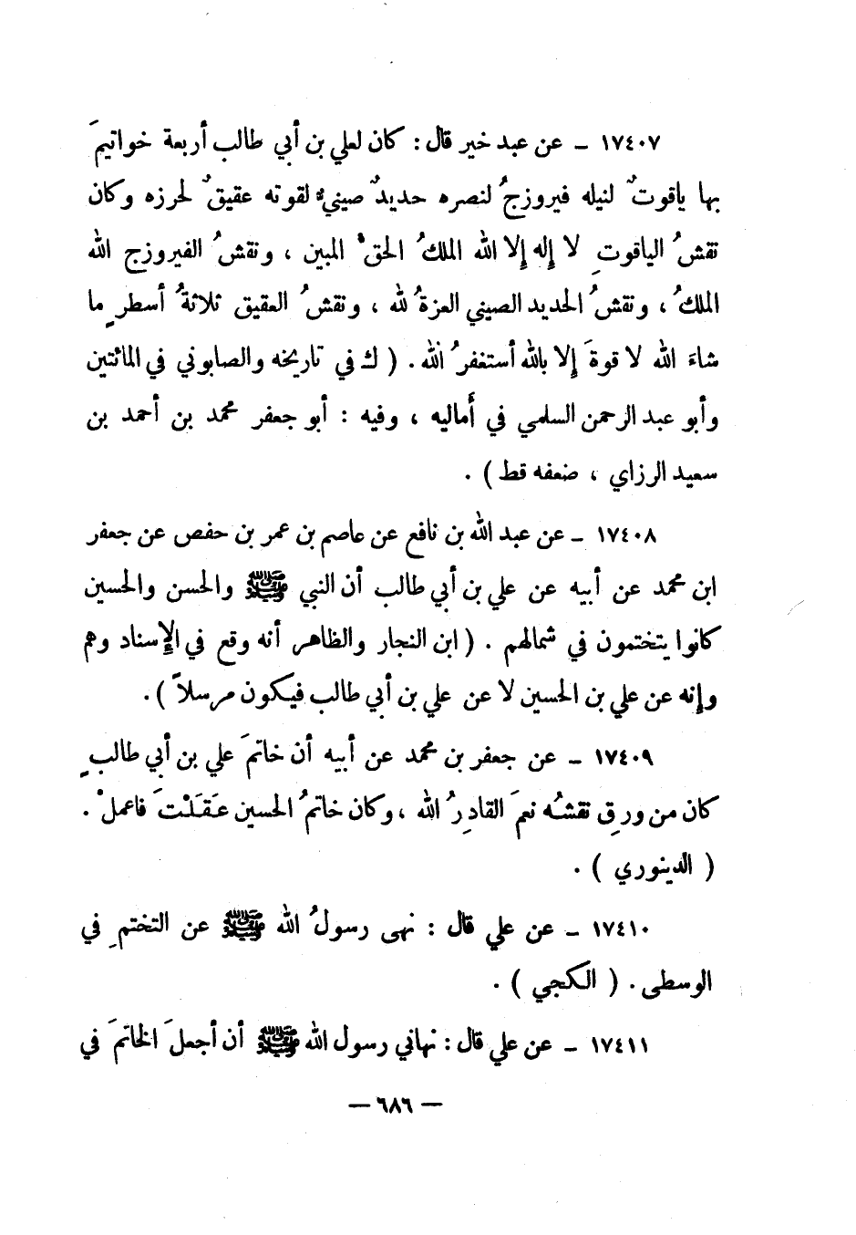 17407- عن عبد خير قال: "كان لعلي بن أبي طالب أربعة خواتيم بها ياقوت لنيله فيروزج لنصره حديد صيني لقوته عقيق لحرزه وكان نقش الياقوت لا إله إلا الله الملك الحق المبين، ونقش الفيروزج الله الملك، ونقش الحديد الصيني العزة لله، ونقش العقيق ثلاثة أسطر ما شاء الله لا قوة إلا بالله أستغفر الله". "ك في تاريخه والصابوني في المائتين وأبو عبد الرحمن السلمي في أماليه، وفيه: أبو جعفر محمد بن أحمد بن سعيد الرازي، ضعفه قط".