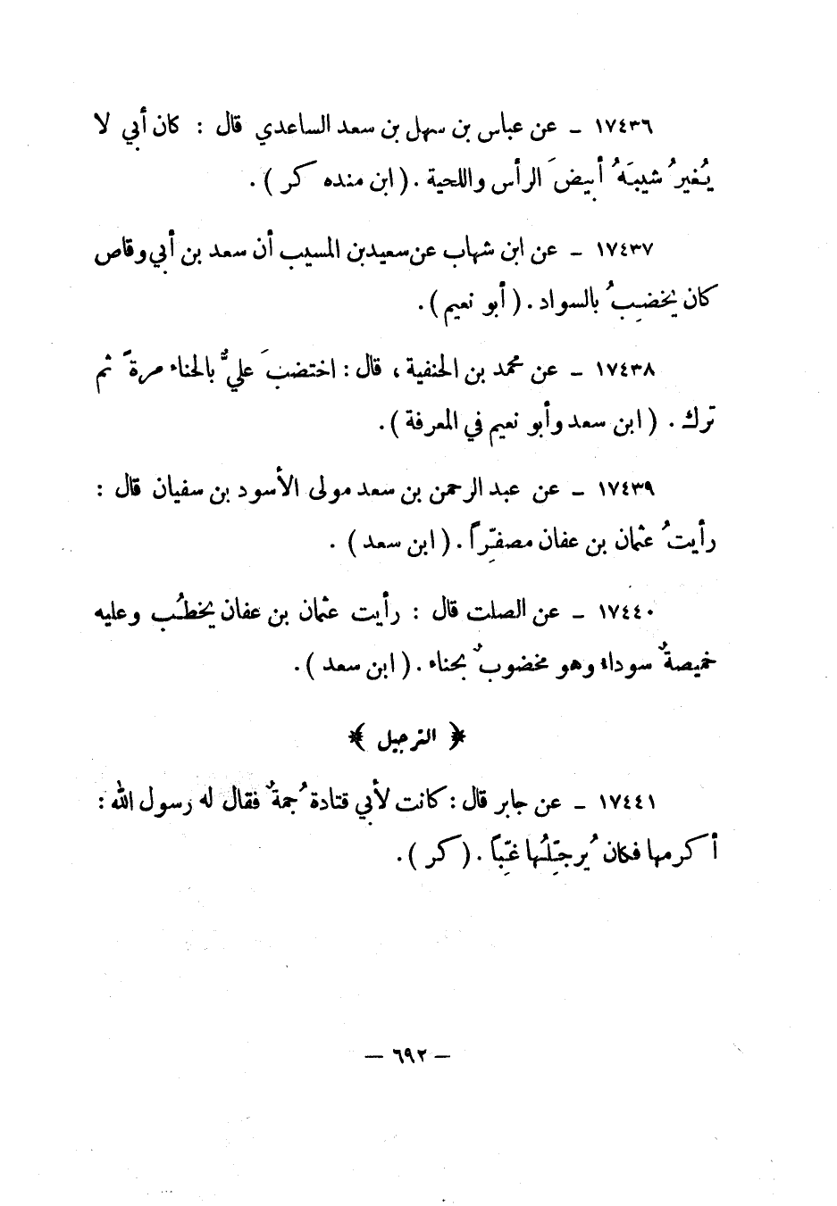 17436- عن عباس بن سهل بن سعد الساعدي قال: "كان أبي لا يغير شيبه أبيض الرأس واللحية". "ابن منده كر".