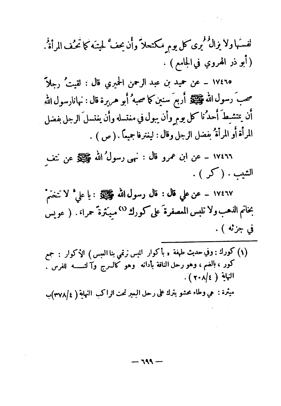 17467- عن علي قال: قال رسول الله صلى الله عليه وسلم: "يا علي لا تتختم بخاتم الذهب ولا تلبس المعصفرة على كورك 1 ميثرة حمراء". "عويس في جزئه".