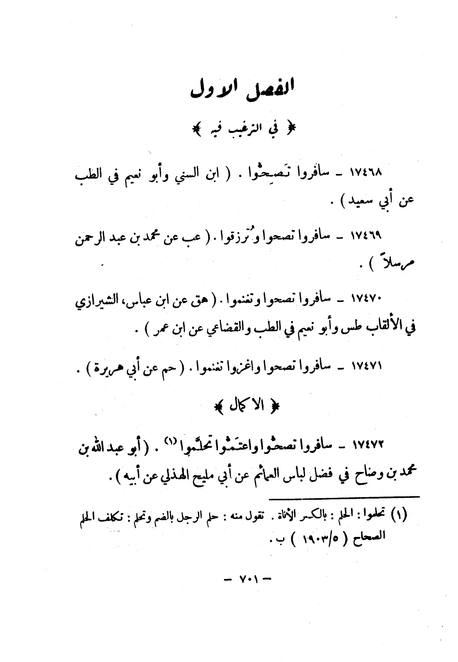 17472- "سافروا تصحوا واعتموا تحلموا" 1. "أبو عبد الله بن محمد بن وضاح في فضل لباس العمائم عن أبي مليح الهذلي عن أبيه".