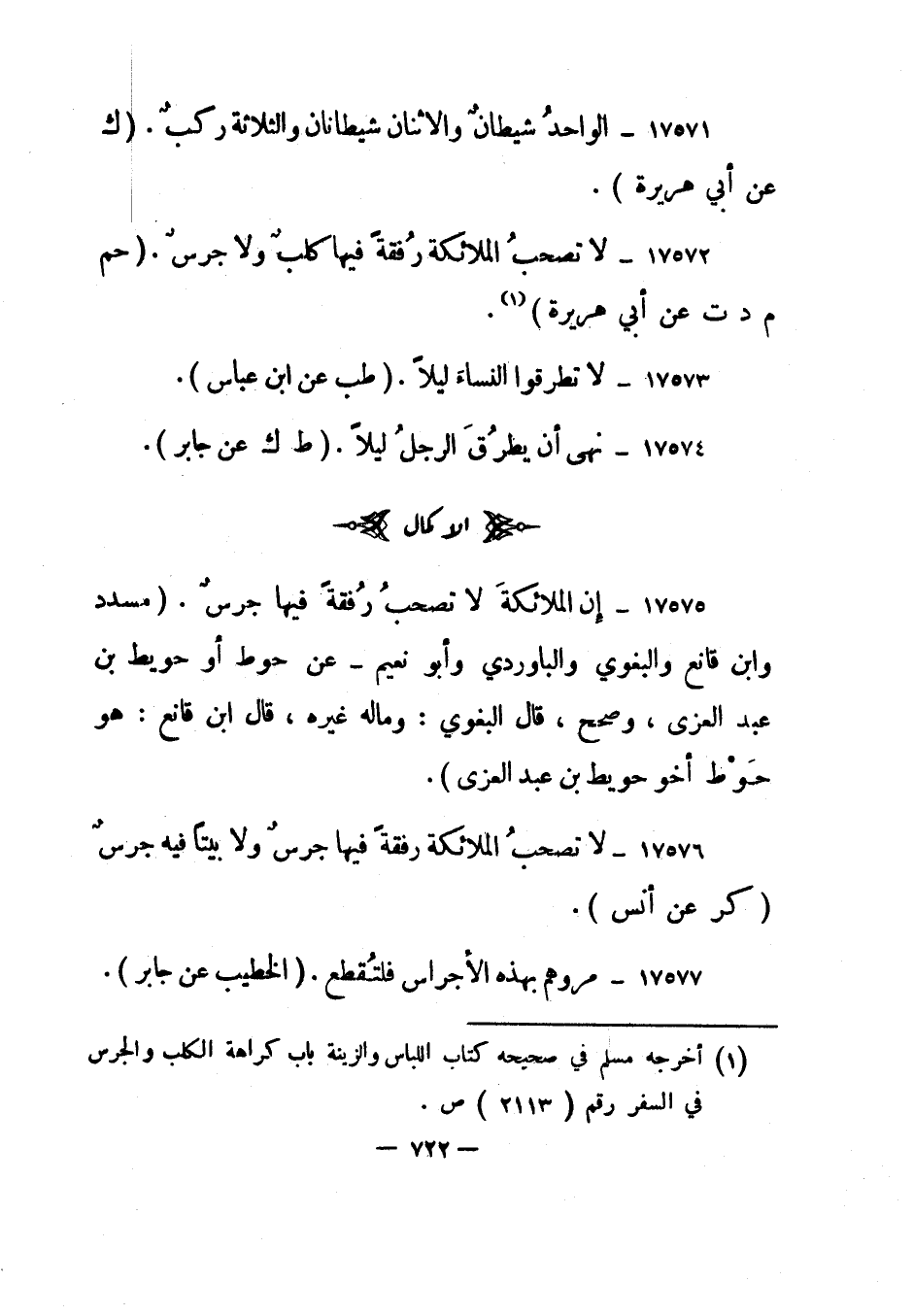 17571- "الواحد شيطان والاثنان شيطانان والثلاثة ركب". "ك عن أبي هريرة".