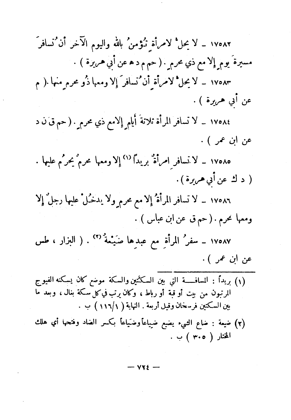17584- "لا تسافر المرأة ثلاثة أيام إلا مع ذي محرم". "حم ق ن د عن ابن عمر".
